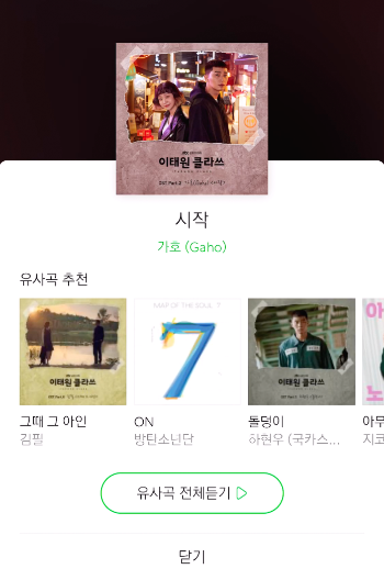홈에 접속해서(홈) > 원하는 노래를 찾거나 내 플레이리스트의 노래를 듣고(검색, 재생목록) > 플레이 화면에서 유사곡 추천을 이용한다 (노래 재생)
