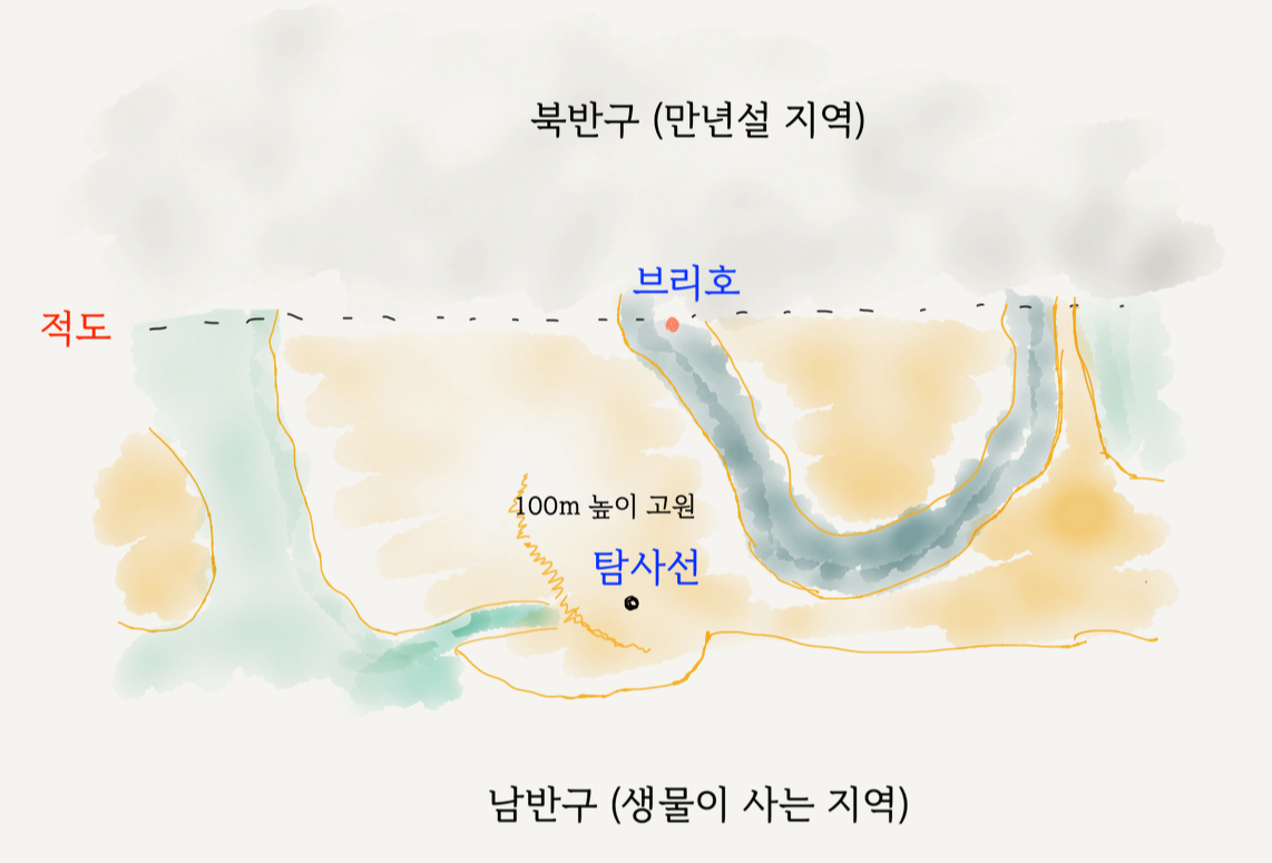 책의 묘사를 따라 발리넌의 여행길을 대충 그려봤다. 일단 메스클린 행성은 바다가 둘인데, 하나는 발리넌의 브리호가 탐험하던 곳으로 고리형이고 다소 좁으며, 적도 부근에서 시작해 행성 반대편 적도까지 이어진다. 이 바다에서는 탐사선에 제일 가까운 곳이라고 해도 약 6천 킬로미터 떨어져있다. 다행이 또 다른 바다는 목적지까지 80 킬로미터 떨어진 강과 연결된다. 아무래도 발리넌은 고리형 바다 안쪽 대륙에 사는지, 다른 바다에는 가본 적 없다고 한다.