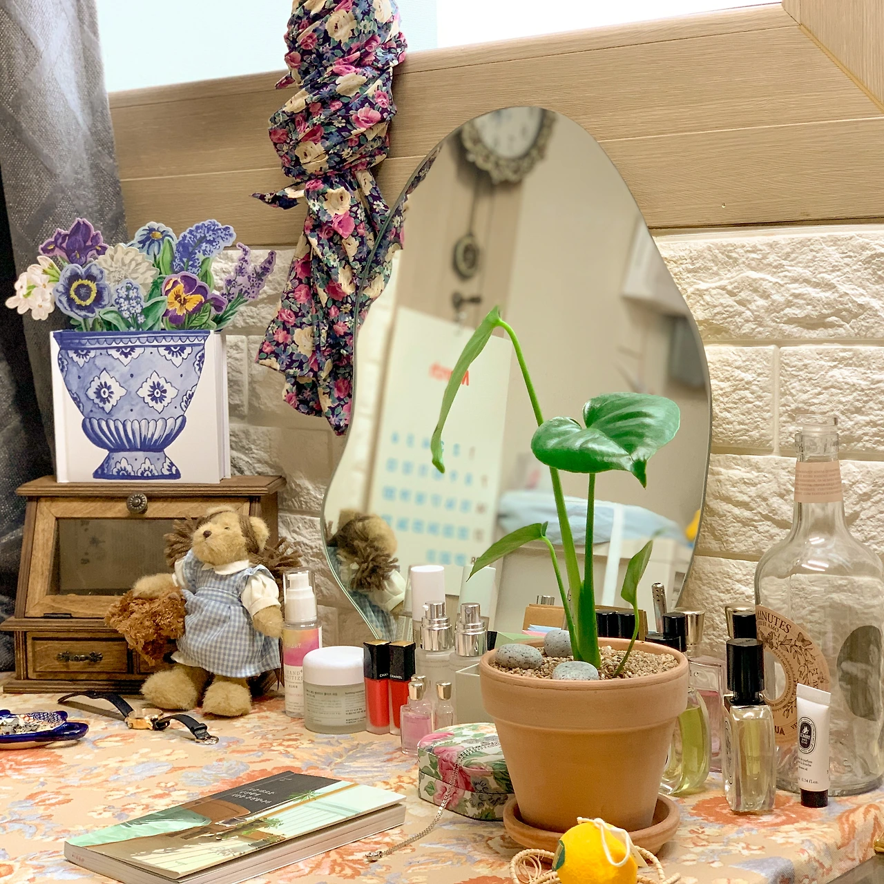 그러고 나니 거울도 있겠다, 화장대도 만들어진 거 같아서 책상 의자 하나로 화장대와 책상 사이를 왔다 갔다 하는 대신, 화장대용 스툴도 새로 구입했고 여태 모아 온 소품들로 서랍장 위를 작정하듯 꾸며두었어요.
