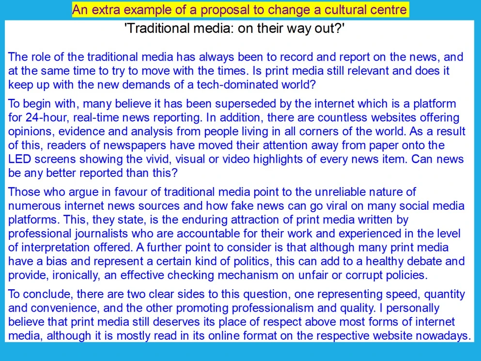전통적인 미디어를 옹호하는 사람들은 수많은 인터넷 뉴스 소스의 신뢰할 수 없는 특성과 가짜 뉴스가 많은 소셜 미디어 플랫폼에서 어떻게 입소문이 날 수 있는지를 지적합니다. 이것은 자신의 작업에 대해 책임을 지고 제공되는 해석 수준에 경험이 있는 전문 언론인이 쓴 인쇄 매체의 지속적인 매력이라고 그들은 말합니다. 고려해야 할 추가 사항은 많은 인쇄 매체가 편견을 가지고 있고 특정 종류의 정치를 나타내지만 이것이 건전한 토론에 추가될 수 있고 아이러니하게도 불공정하거나 부패한 정치에 대한 효과적인 점검 메커니즘을 제공할 수 있다는 것입니다.