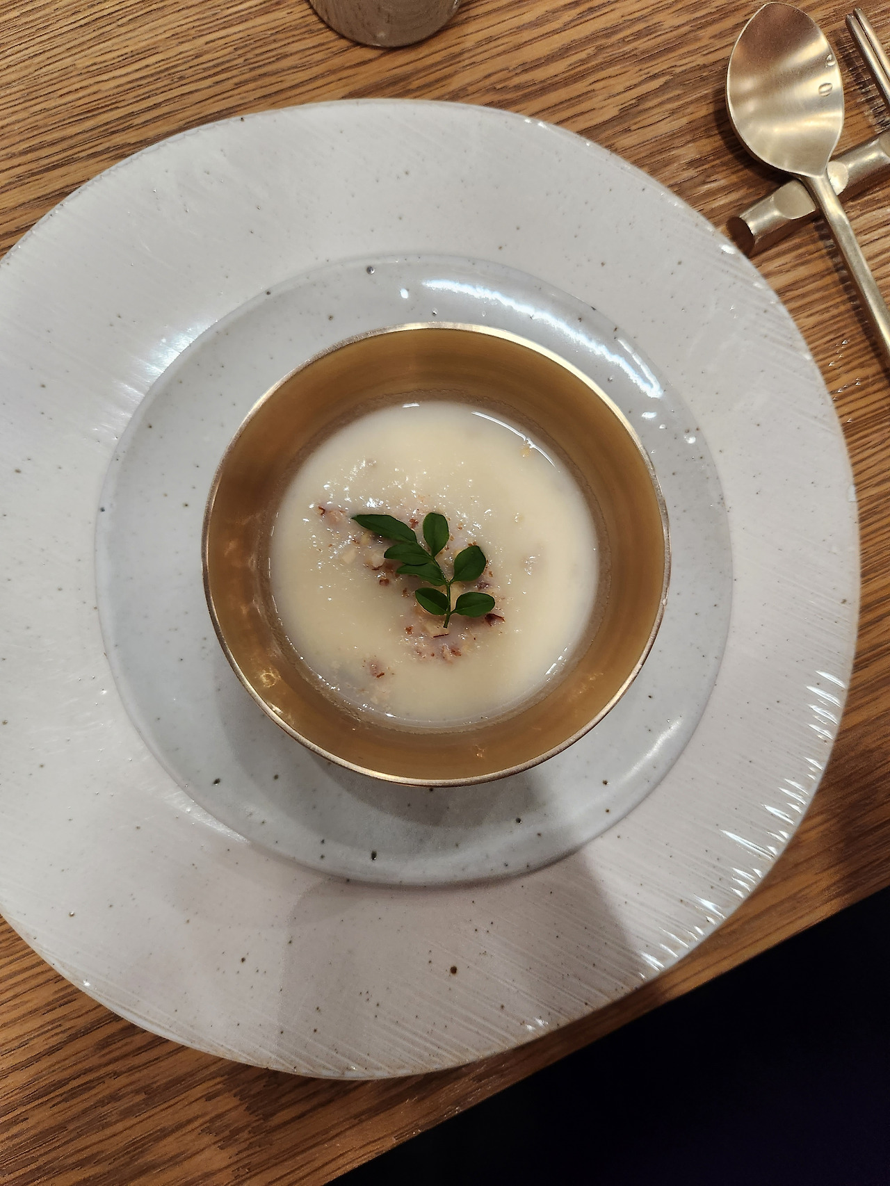 이번에는 캐비어로 만든 주먹밥을 김치 없이 먹어보라는데, 캐비어만 오감을 통해 맛보라고 티스푼 가득 담아 올려 나왔다. 알이 톡톡 터지는 촉감도 느껴지고 비릿한 향도 있다. 아마 가격에 비해 캐비어 맛을 그다지 공감하지 못하는 게 아닐까? 비싸고 귀하다고 맛있는 건 아닐 것이다. 냉동해서는 안 좋은 지 간수를 뺀 소금으로 염장을 한다. 짭조름한 맛은 방부제를 넣지 않고 소금에 절이는 과정에서 나오는 맛이었다.