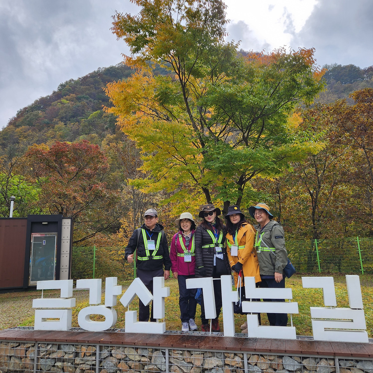 파로호와 습지공원 내에서 인공섬인 한반도섬에서 발대식을 갖고 출발해 파로호 둘레길인 소지섭길을 따라 인문학박물관을 지나 마침 군민축제가 열리고 있는 종합운동장에서 점심식사를 합니다. 식사 후 곧 승차해서 오후 1시에는 비득검문소를 통과해야 합니다. GPS목걸이 대신 비득검문소에서 군 선도 차량의 호위하에 제2코스를 관광합니다. DMZ생태 환경단체로서 군당국의 허락을 받고 엑스밴드(X-band) 조끼를 입고 에스코트를 받는 운 좋은 날입니다. 3시간 정도 걷게 됩니다. 통상의 관광코스는 금강산 가는 길 안내소에서 GPS목걸이를 차고 13시 차량이동 두타연 안내소를 통해 양구전투위령비 조각공원으로 가는 제1코스(양구군청에서 관리)입니다.