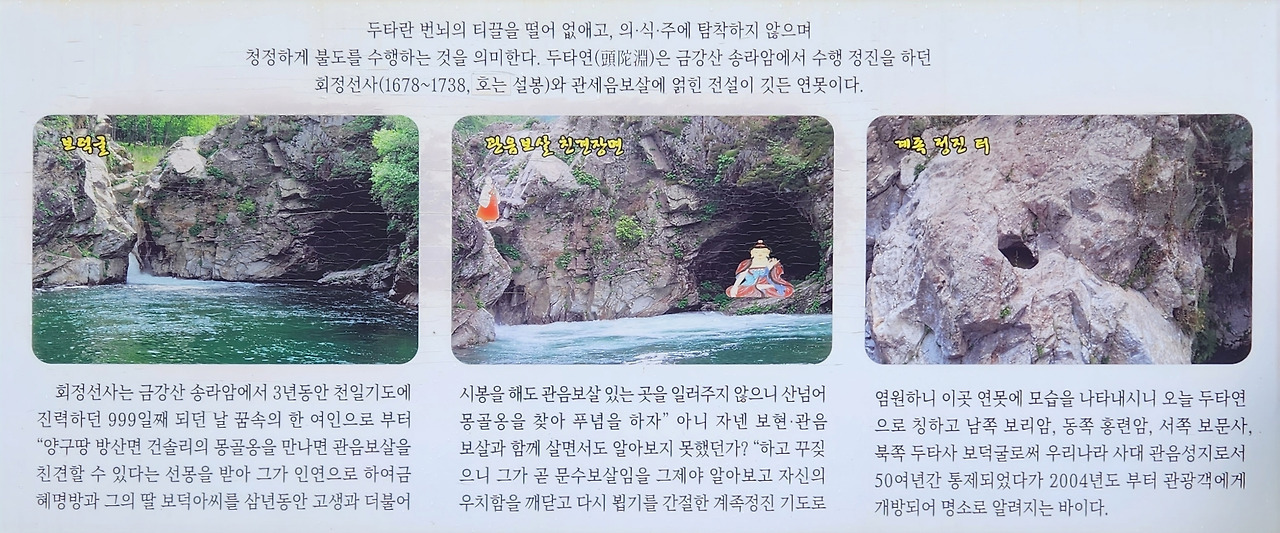 두타(頭陀)는 세속의 번뇌를 버린다는 뜻으로 산스크리트어 음역에서 유래되었습니다. 의식주집착을 버린 수행을 가리킵니다. 두타연은 신라 천년 고찰이었던 두타사에서 비롯된 연못이라고 하겠지요. 폭포와 연못을 가까이 둔 보덕굴은 저절로 해탈할 것 같은 멋진 곳이지요. 천년이 흐른 시점의 우리는 세속의 번뇌를 잊고자 하나 70여 년 전 6.25 전쟁에서 산화한 무명용사들을 생각하면 번뇌가 요동을 치고 있습니다.