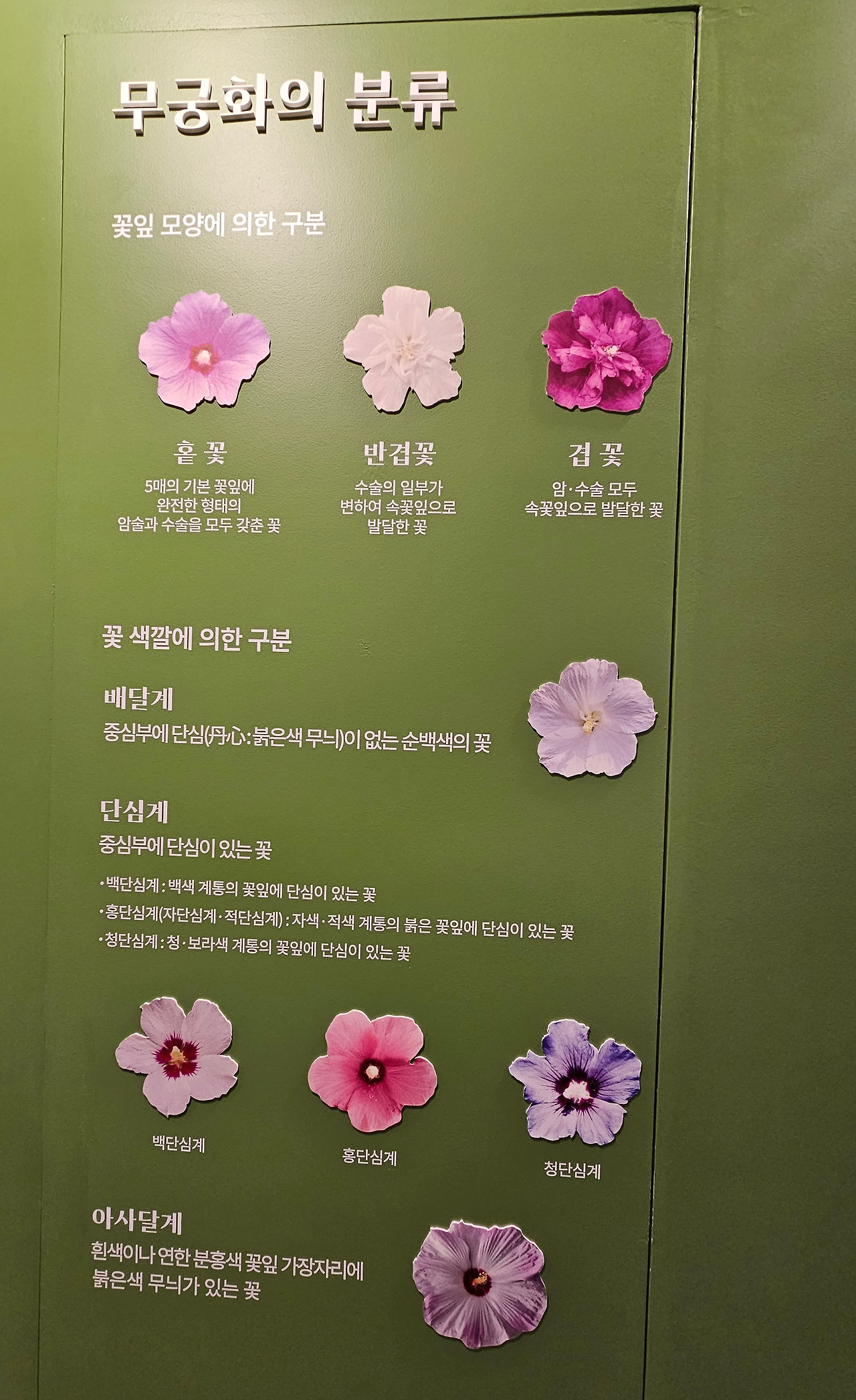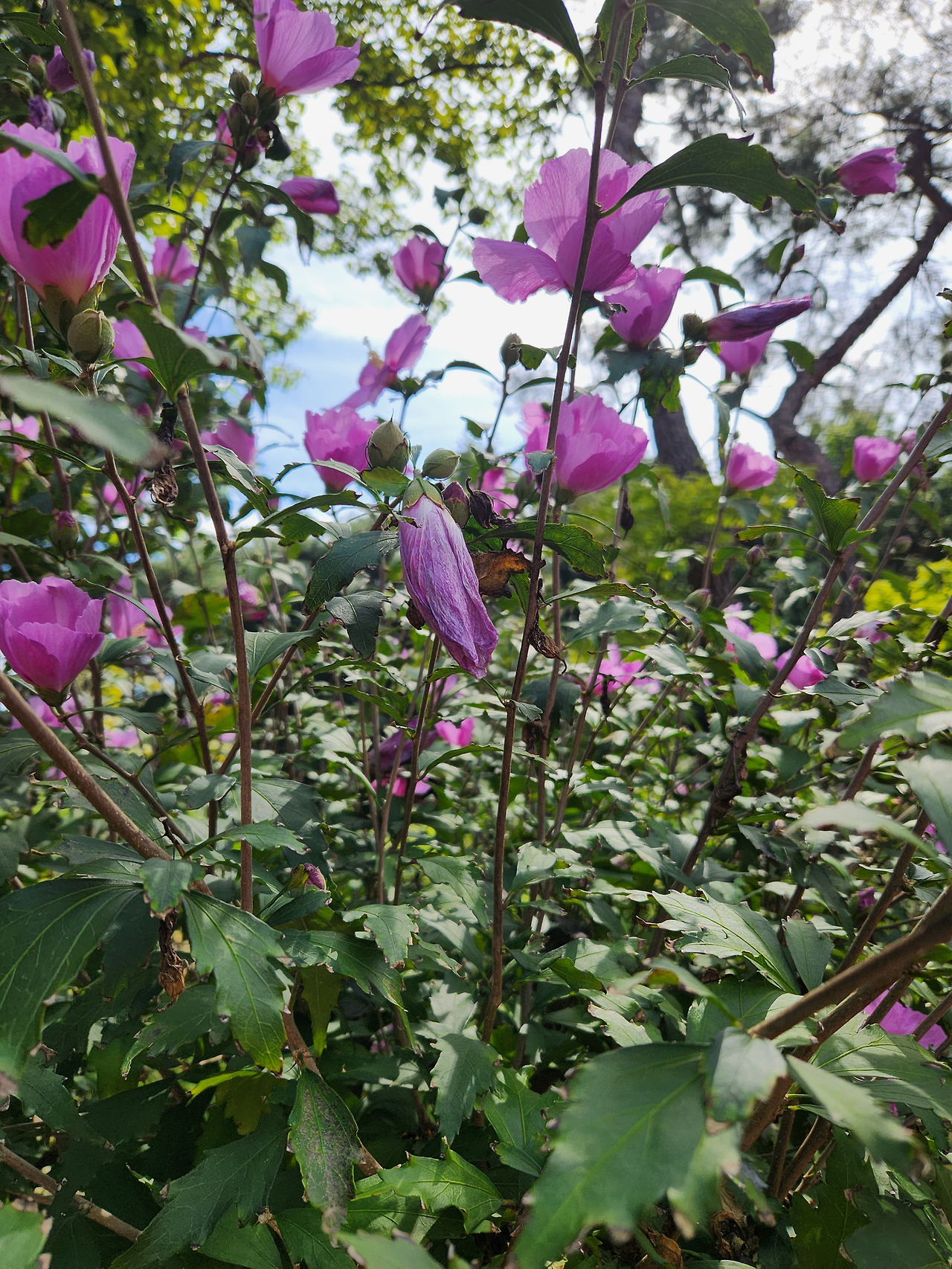 며칠 전 무궁화역사관에서 본무궁화 꽃 이름 설명이 떠올랐다. 무궁화는 꽃의 중심에 무늬 없는 순백의 배달계와 붉은 무늬가 선명한 단심(丹心)계로 구분한다. 백, 홍, 청 단심계로 세분되는데 이름을 알고 보아서인지 더욱 아름다웠다. 무궁화(無窮花) 이름도 잘 지었다. 무궁무진 피기 시작하면 100여 일간 피고 지며, 시든 꽃마저 아름답다. 꽃잎은 최장 15시간 피었다가 돌돌 말리고 시드는 데땅에 떨어져도 아름답다.아파트에 핀 화려한 목련꽃도땅바닥에서 무참해 보여 슬프지 않았던가. 윤동한 관장은 '시든 무궁화 꽃잎은 어머니가 푸른빛이 감도는 치마를 여민듯하다'라고 했다. 어머니 생각이 났다. 다시 바라보니 어머니의 휘감은 치마폭처럼 예뻤다.