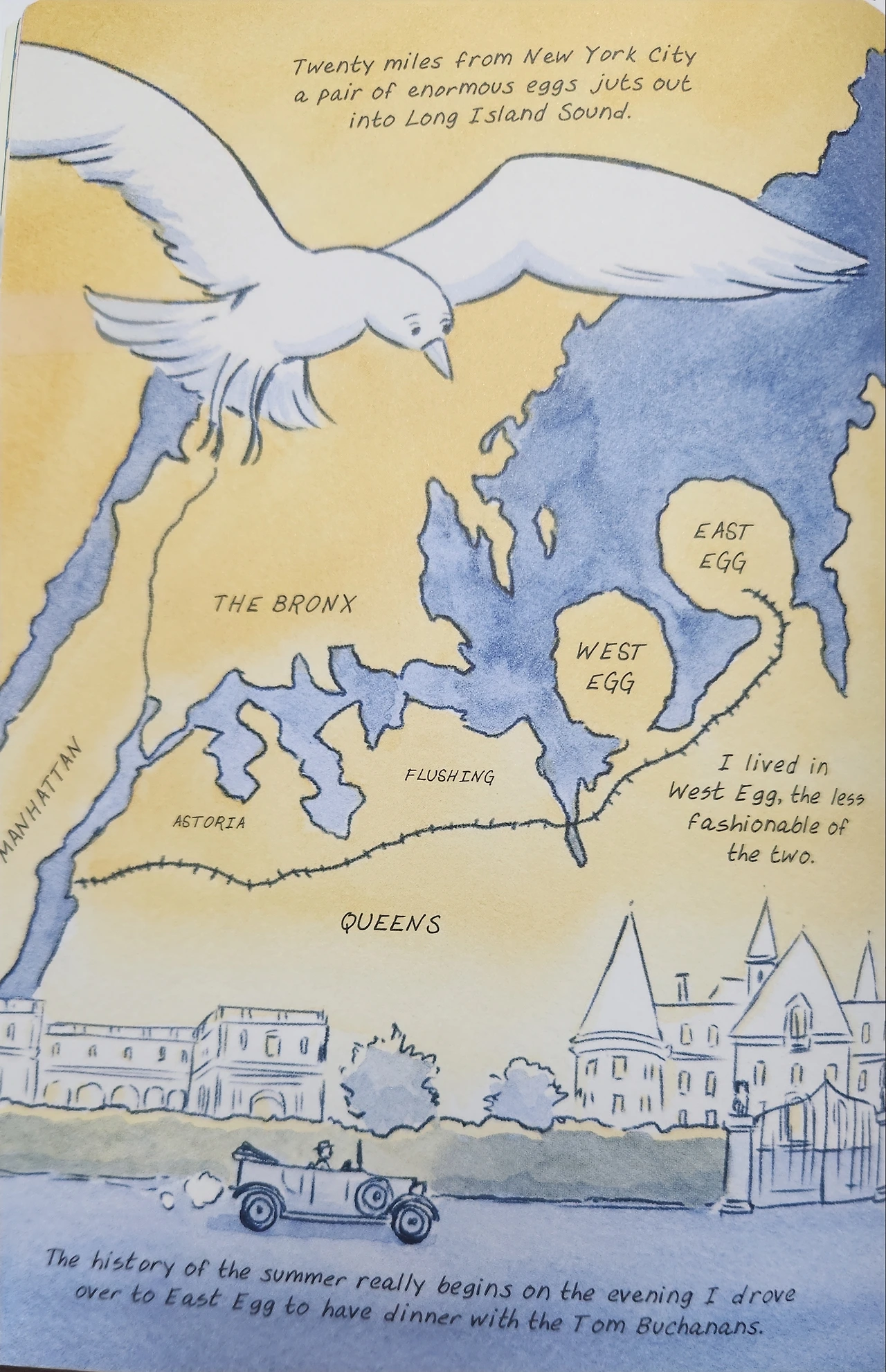 그녀는 브로드웨이에서 뻗어 나오다가 롱아일랜드 한편에 자리 잡은 웨스트에그라는 저택에서 어떤 두려움을 느끼고 있었던 것이다. 그것은 예부터 내려오는 사투리와 함께 꿈틀거리는 이곳의 생명력, 결국은 모두 흙으로 돌아갈 사람들이 서로 아웅다웅하며 경쟁을 하고 있는 이 지방 사람들의 강한 생활력, 그런 것에서 느끼게 되는 두려움이었다. 그녀는 자신이 이해하기 어려운 소박함 속에서 어떤 무서운 것을 보았던 것이다.
