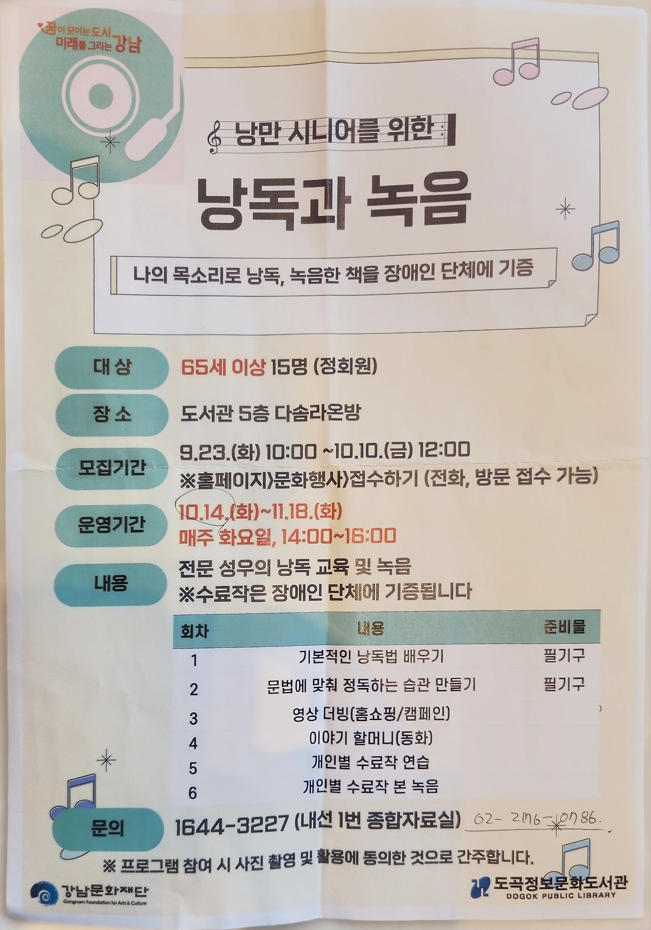 낭독을 전문 성우로부터 배울 기회가 눈에 띄었다. 도곡1동 정보도서관의 6주간 낭독교육 프로그램이다. 제대로 낭독을 배우고 봉사할 수 있기를 열망하는 분들이 모였다. 시각장애인에게 우리들의 목소리로 녹음된 동화를 전해주는 일이 1차 목표이다. 목소리로 봉사하는 이야기 할머니가 되는 일이다.