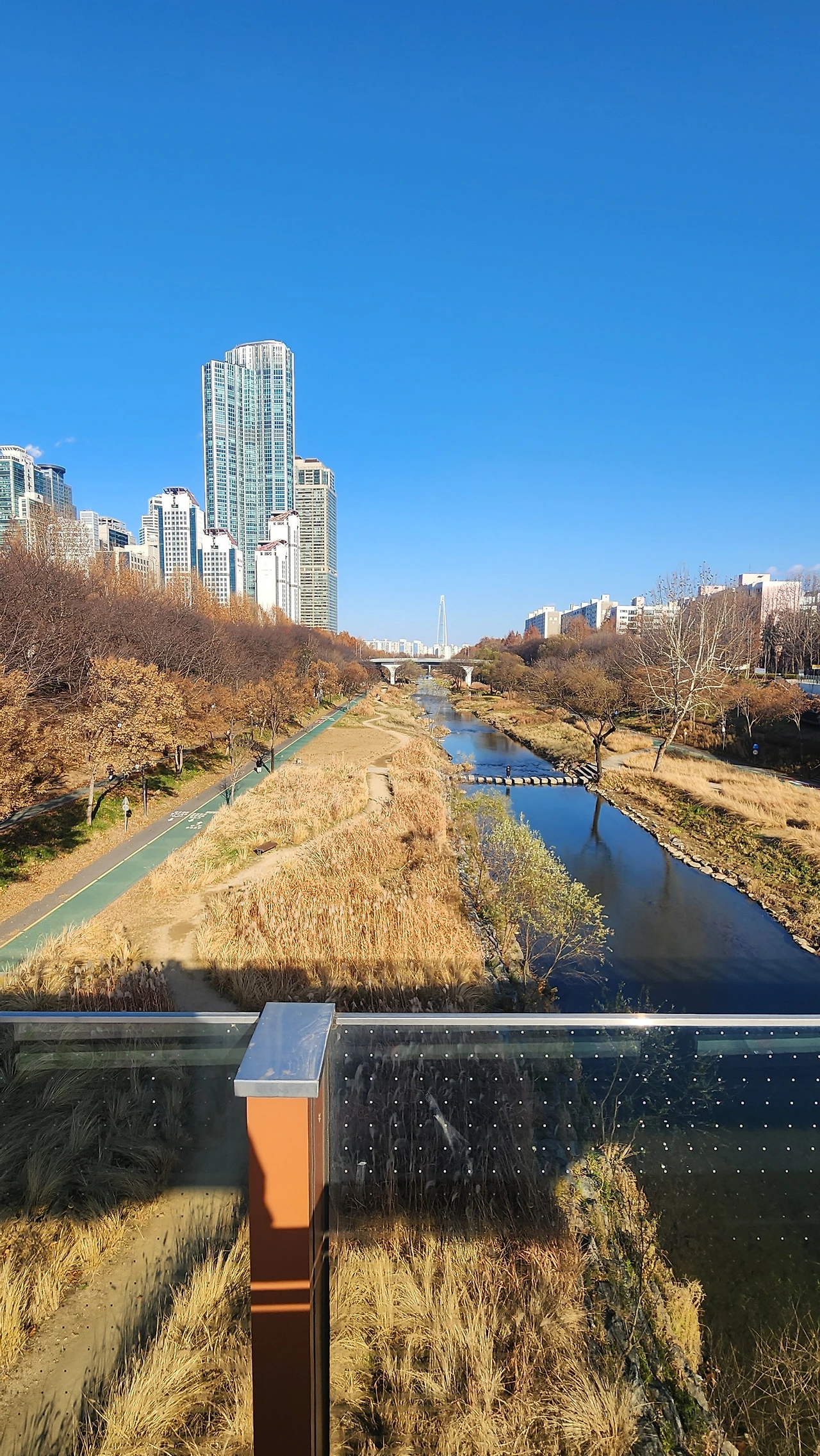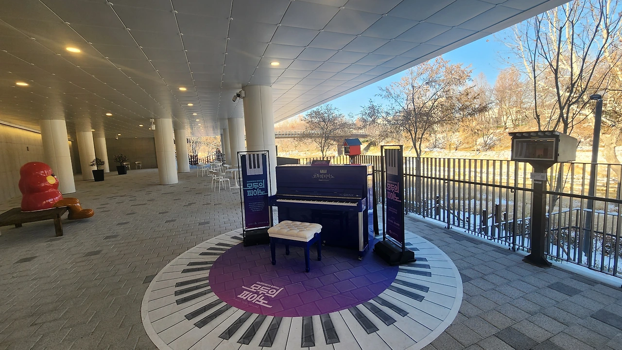집에서 5분 거리 아파트를 돌아 나와 밀미리다리를 건너면 바로 양재천 산책로에 연결된다. 밀미리다리는 보행자 전용다리로 차량이동도 없어 동네의 랜드마크 역할을 한다. 봄여름가을까지 꽃으로 장식된 포토존이 볼만하다. 다리 위에서는 서쪽에서 동東으로 흐르는 양재천 물길이 멀리까지 내려다보인다. 강폭 150여 m 양재천변 양옆으로 키 큰 갈대꽃이 화려한 오솔길은 황톳빛을 선명하게 드러냈더랬다. 다리 건너 적십자 혈액원 옆에 무슨 공사를 하는 것일까? 카페인가? 강남구 50주년을 기념사진으로 도시의 변천을 세월로 읽었다. 수변문화쉼터라는 곳이 되어 문을 열었다. 2층 너른 슬라브에 파라솔도 놓여있다. 수변문화센터라는 입간판과 야외 조각들이 설치되고 새집 같은 갤러리들이 한동안 호기심을 키워나갔다. 수변 쪽으로 트인 아래쪽 공간은 '모두의 피아노'로 산책하면서도 수준 있는 연주소리를 들을 수 있었다. 이른 아침 단학기공 운동에도 참여해 보았다. 발길은 저절로 수변문화쉼터로 향한다. 혈액원의 슬로건은 불러드림(Blood Dream)으로 큼직하다. 헌혈하라고 불러드림인데 이곳 밀미리다리는 쉼터까지 더해져 표어하고 잘 어울린다. 누구든 불러들이고 싶은 곳이다. 걷다가 클래식음악이 잔잔한 실내에서 쉬기도 하고 질 좋은 자판기 커피를 마실수도 있다. 돌아가는 길이 되겠으나 다시 되 걸어도 좋을 만큼 잘 쉴 수 있다.