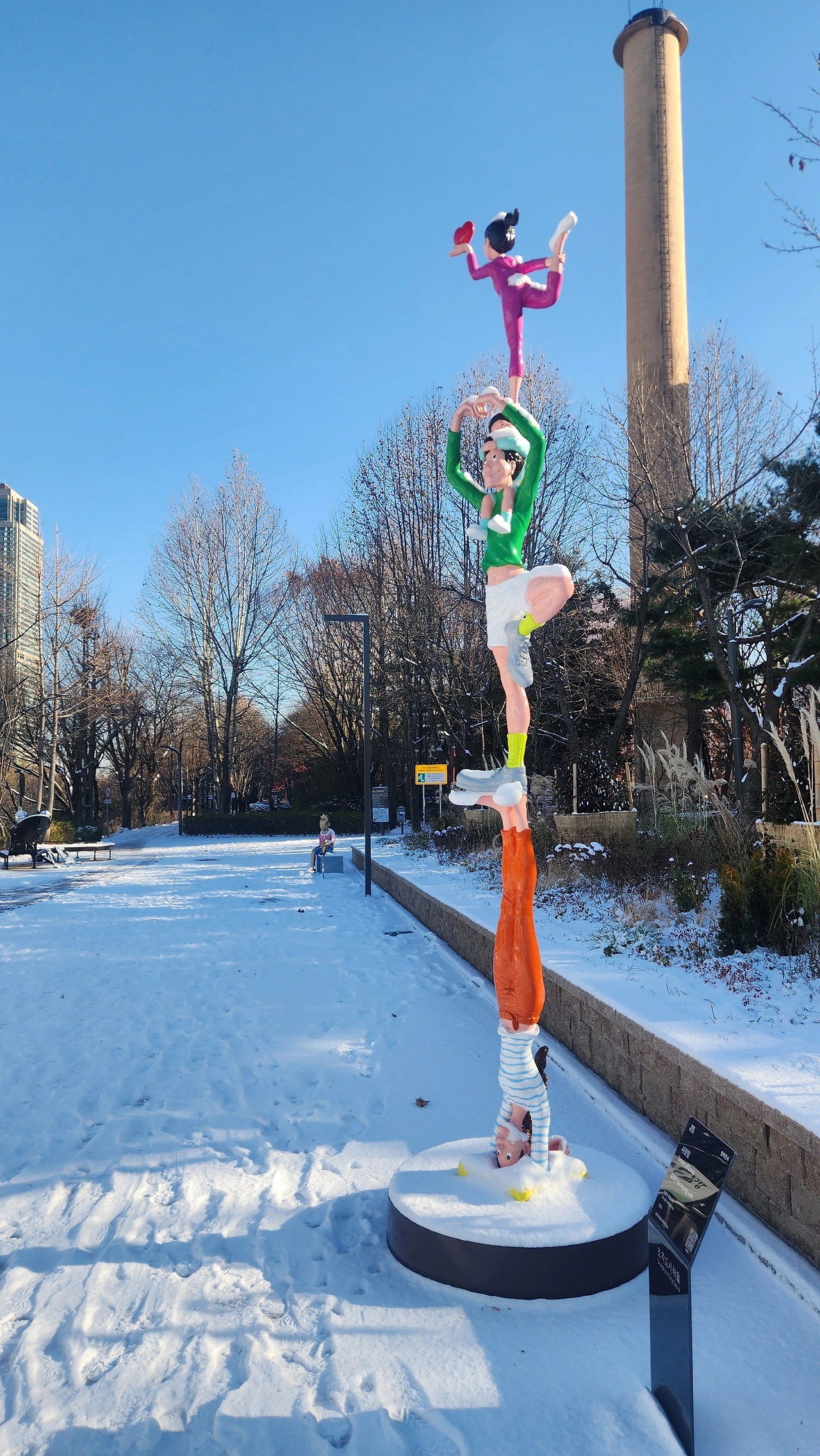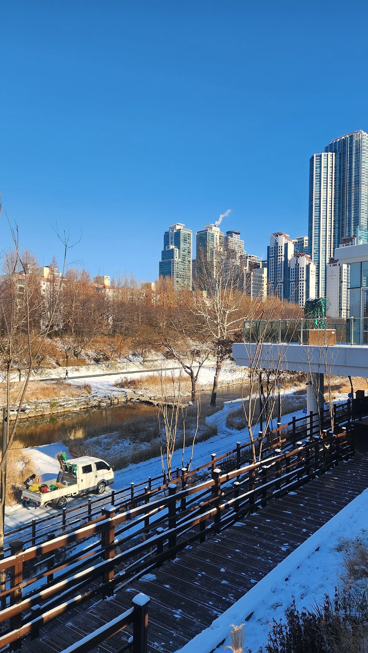 12.4일 늦은 첫눈이 제대로 내렸다. 기습폭설로 볼맨소리도 듣지만 지난해보다 늦은 여드레만큼 첫눈은 더 반가웠나 보다. 새벽 도로상태는 차량이 다니는데 지장 없고, 되레 보도 위 사람들이 뒤뚱 총총 위태하다. 오전 10시에는 햇살이 창으로 듬뿍 들어오고 있어 수변문화쉼터 풍경을 보고 싶었다. 다른 지역의 첫눈 풍경을 보러 외출해도 좋겠으나, 북유럽에서 반갑게 궁금해할 막내가 떠오른다. 제 집 안마당 같을 양재천이다.