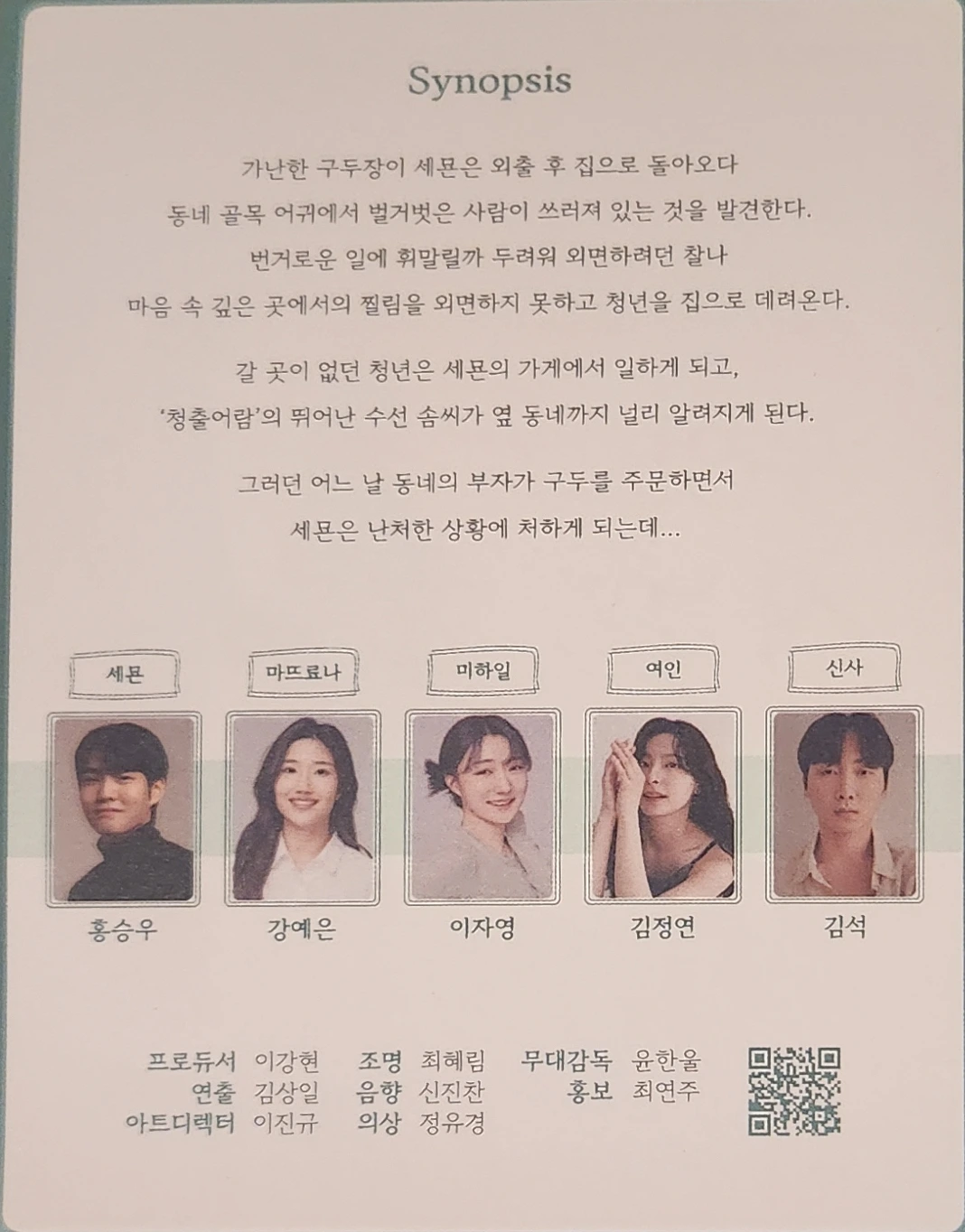 걸어갈 수 있는 가까운 곳에 모처럼 연극을 보러 온 거다. 톨스토이 단편이 묵직하게 다가온다. 책으로 읽은 <사람은 무엇으로 사는가>를 연극으로 볼 수 있어 좋다. 우리 동네에 붙은 연극 플래카드 광고가 낯설게 느껴졌던 이유는 대학 다니던 때 연극하면 떠올리던 곳이 주로 동숭동이었기 때문이다. 연극 주제로 보더라도 색소폰 발표때와 분위기가 다르다. 3만 원 티켓, 강남문화재단이 후원하니 예산걱정 없이 치를 수는 있을 것 같다. 젊은이들의 철학을 만나보고 싶다. 청년예술 지원하는 셈으로 쳐도 좋다.