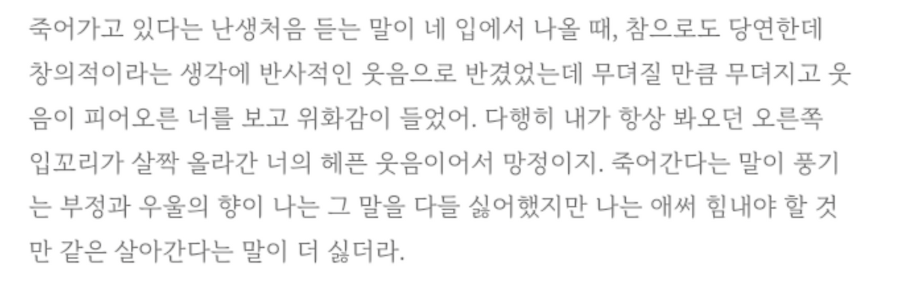 그러다 어느 순간, 내가 나를 속이며 글을 쓰고 있었다. 있어 보이는 표현들로 떡칠을 해가며 그럴듯해 보이는 의미를 전달하는 껍데기 같은 글들을 말이다. 회의감이 들었다. 스스로에게 솔직하면서도 깊이 있으며 사람들의 심장을 헉! 하게 만들고 싶었다. 그런데 나에겐 그럴만한 이야기도 없었고, 그럴만한 문장을 쓸 노련함도 없었다. 삶은 너무나도 평범했고 그에 따라 당연하다는 듯이 평범한 문장들이 삶에 대롱대롱 매달려 있을 뿐이었다.