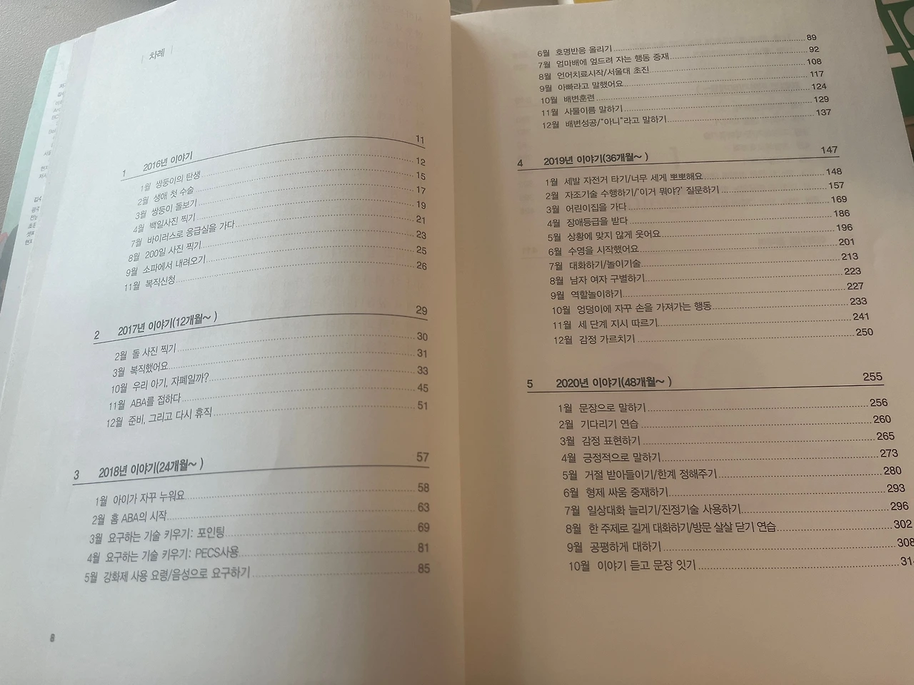책은 수진님의 아이가 태어나서부터 자폐를 의심하게된 상황, 진단 전후의 부부의 고민, 노력, 성과를 시간 순으로 아이 개월 수에 맞춰 쓰여졌습니다.