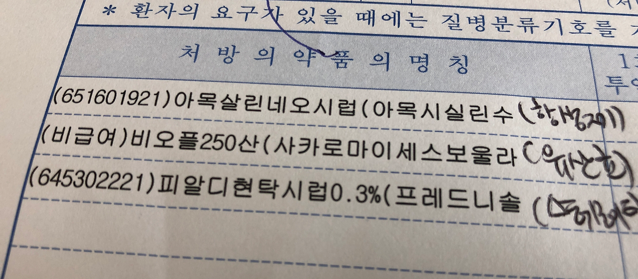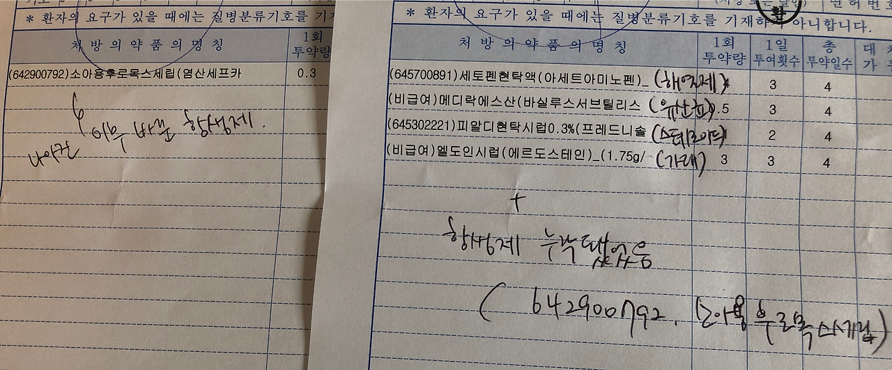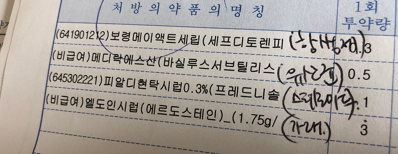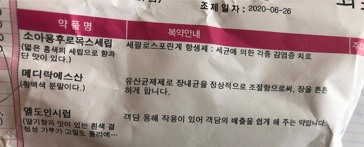 아직 콧물 찍찍... 의사 조언으로 항생제 또 바꾸다. 이 항생제 쎈건지.. 먹자마자 콧물이 확 줄어든 느낌이 들었다. 병원의사의 처방전 누락으로 두장으로 나눠져있음.