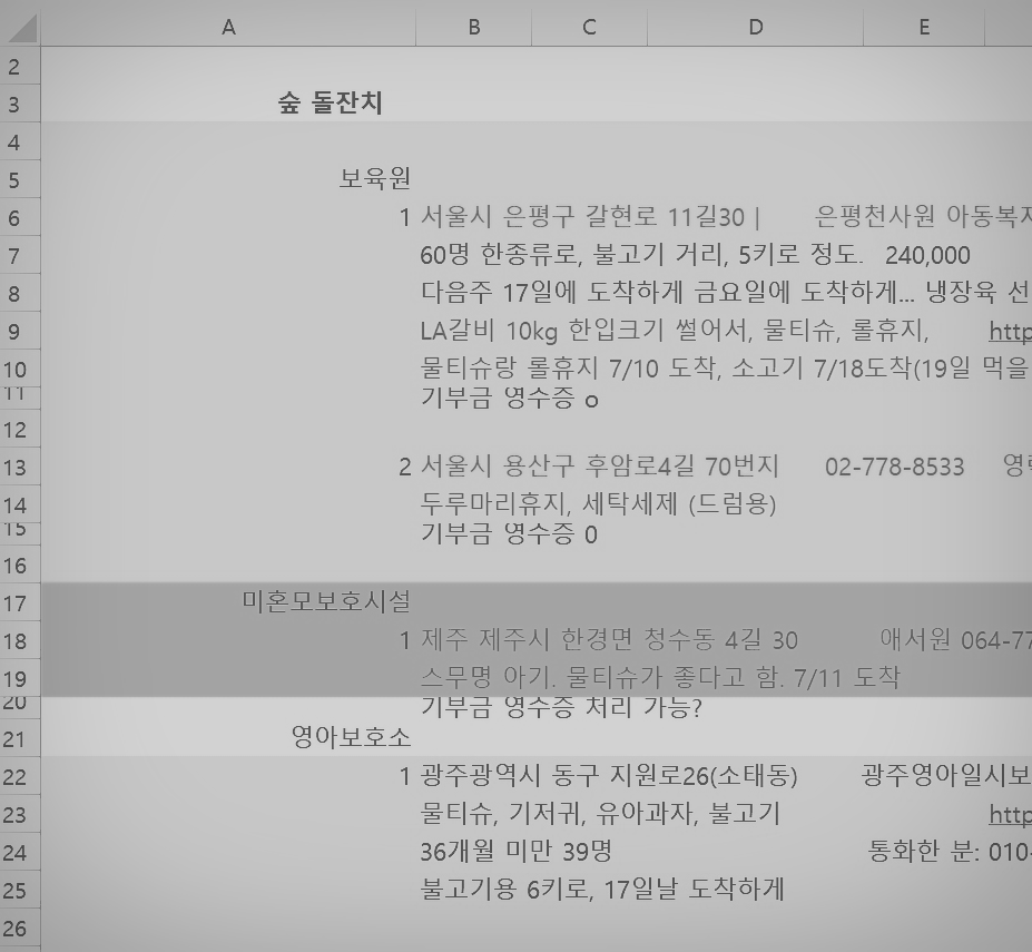 오랜만에 회사 일처럼 엑셀을 켰다. 보육원마다 수요조사를 하고, 열에 맞춰 필요한 물건들을 기입하고, 각 대표 품목의 가격으로 예산에 맞춰 물품 주문을 넣기 시작했다. 천원 아쉬워 우리 아기도 못쓰는 물건들로 나름 선정했다. 베베숲 시그니처 물티슈와 하기스 네이처메이드 썸머 라인업 등... (숲이가 서운해하지 않겠지?) 소고기는 각 원에서 급식으로 쓸 날을 정해, 원하시는 소고기 부위를 조사해서 정육점에 주문했다. 물건들을 네이버와 쿠팡에 주문하는 과정은 단순했지만 상당히 귀찮았다. 모든 일이 그러하듯 중간에 별 이슈가 많았다. 특히 아기들 마스크를 주문하면 취소되고 주문하면 취소가 되어서 정말 화딱지가 났다. 코로나 이 수박 씨발라먹을 자식...