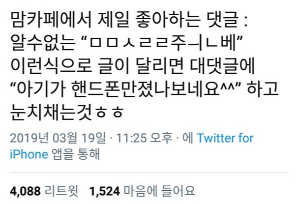 오늘 불현듯 누군가 뱉어놓은 맘까페에 대한 욕들을 지나치지 못하고 욱하는 마음에 지난 일년간 맘까페를 사용한 소회를 끄적여보려고한다. 맘까페는 그런 취급을 받을 클래스가 아니라는 이야기를 하고싶어서다. 맘까페만큼 지친 육아맘에게 온기를 줄 수 있는 게 몇이나 된다고? 엄마들이 정신줄을 놓고 SOS를 칠 때, 밤낮없이 그 곁에 있어주는 건 남편이 아니었다. 맘까페, 그것은 육아라는 한겨울 혹독기에 아버님댁에 놔드린다던 전기보일러 만큼이나 훈훈한 것이었다.
