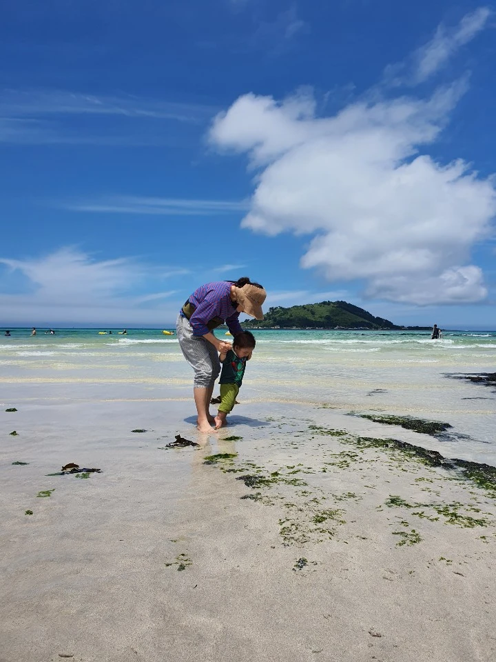 지난 주말에는 큰 맘을 먹고 제주의 한 바닷가를 향했다. 아이가 처음 발을 담가 본 바다였다. 겁먹은 소리로 내 옷자락을 쥐던 아이는 금새 발가락 사이 모래알에 관심을 보였다. 거리두기를 실천하느라 사람들과 떨어진 구석 바닷가지만 멀리서 들리는 아이들의 웃음소리와 물장구 소리가 뒤섞여 마치 오랜만에 들린 옛날의 유행가처럼 반가웠다. 내가 참 좋아했던 그 소리들-