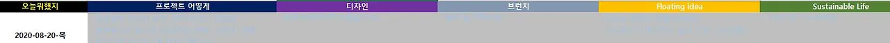 여기에는 내가 지금 진행하고 있는 총 다섯가지의 카테고리 일들로 구분되어 있다. 파트타임으로 하고 있는 일과, 온라인 강의 듣고 있는 것, 요기 브런치에 글을 쓰는 일, 그리고 그날의 떠도는 아이디어와 영감들, 지속 가능한 삶을 위해 하고 있는 일 - 대부분 운동에 대한 기록 이렇게 다섯가지 이다.