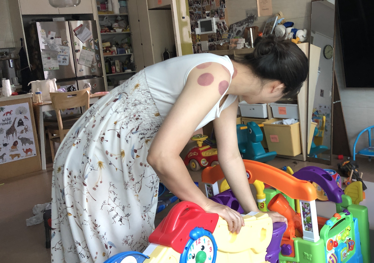 너무 오랜만에 뜬 부황이라 이렇게 흔적을 남기는지 몰랐다. 간밤에 아기가 열이 잔뜩 나 첫 진료를 위해 병원을 나선 오늘 아침에도 문신은 생각지도 못하고 민소매 원피스만 훌렁 입고 나섰다. 애기를 낳기 전만해도 이런 엄마들 보면, 왜 이렇게 주의성이 부족하나- 외모에 대해 신경을 영 안쓰나 생각했던 나였는데 말이다. 나 역시 일년만에 그런 엄마가 되어있었다. 부황자국을 문신이라고 생각하니 부끄러움은 조금 줄어든다. 남편 개그의 순기능 하하-
