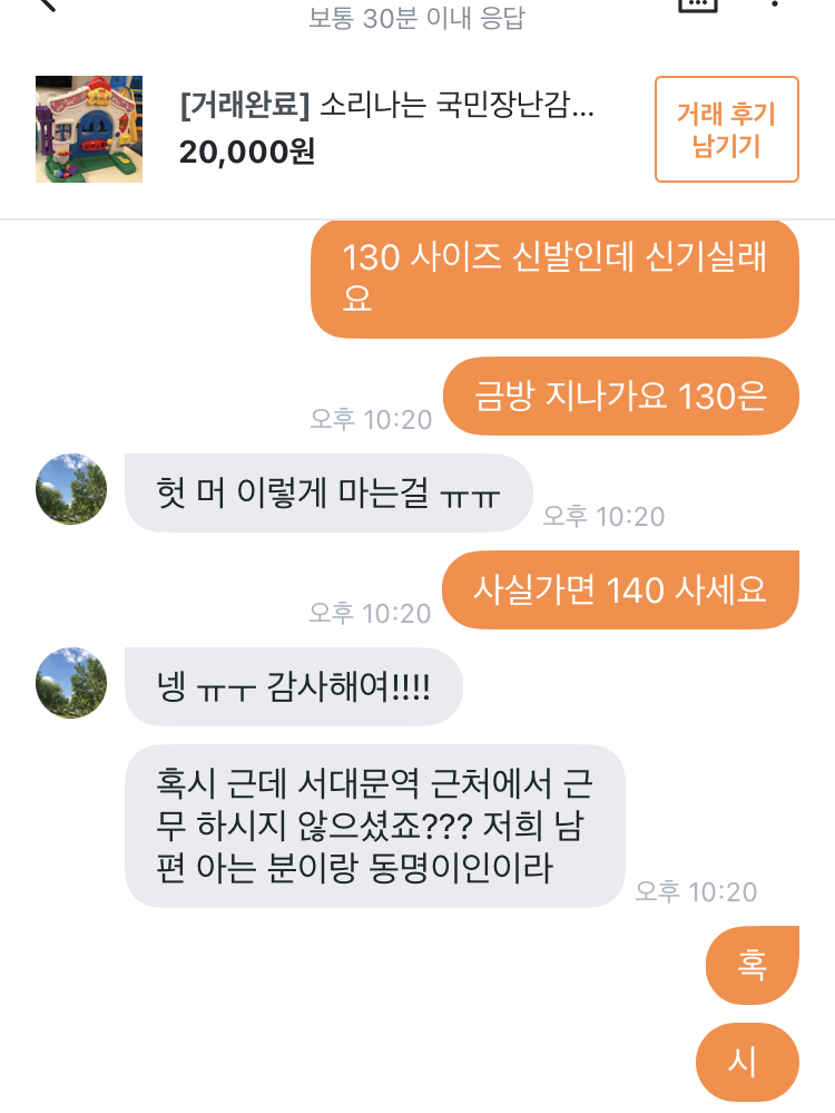 밤 10시반, 즉시 오겠다는 챗팅 몇 건 중에 내가 사는 지역구 안에 있는 사람 한 분을 골랐다. 남편을 데리고 바로 출발했다는 분에게 안쓰는 숲이 물건을 보여주며 갖다쓰실지 대화를 이어나갔다. 꼭 필요한 것들인데 받아도 되느냐며 연신 고마워하는 그 분의 응답 뒤로 예상치못한 질문이 나왔다. 그러니까 내 계좌정보를 준 시점이었다. 나더러 서대문역에서 근무한 적이 있지 않느냐는 질문이었다. 잠들기전 멍했던 내 머리에 띠로리 불이 켜진 순간-