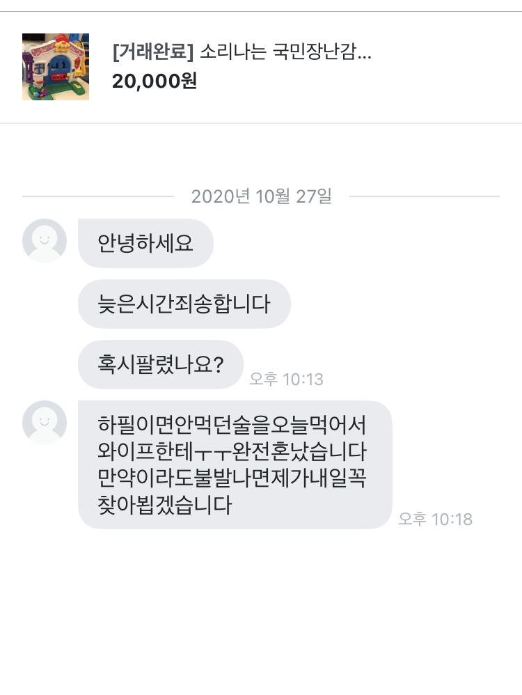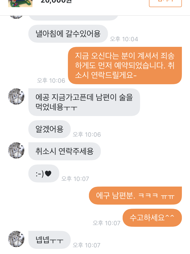 차장님네 부부를 보내고 채팅을 정리하는데, 더 웃긴 장면이 남았다. 아쉽게 구매를 못한 애기엄마였는데 마음은 바로 오고싶지만 남편이 술을 먹어서 내일 오면 안되겠느냐 하여 순위가 밀린 분! 그 분의 남편이었다. 아내가 화가 많이 나서 연락했다며 거래가 되느냐는 긴박한 채팅이었다. 하필이면 안먹던 술을 오늘 먹었다는 남편분의 자책 어린 채팅이 어쩜 이리 귀여운지- 나 역시 핫딜을 놓친 애타는 마음이야 모를리 없는 아기 엄마지만 아내의 당근 셔틀에 부응하지 못해 속상해 하는 남편의 모습은 처음인지라 웃음이 나왔다. 육아템 당근거래는 보통 아이를 돌보는 엄마가 주로 거래을 하고 아빠는 퇴근길에 픽업이나 운전을 맡기에 쉽게 그려지는 그림이었다. 사랑스러운 부부에게 내심 장난감을 못내드려 아쉽다는 생각이 들었다.