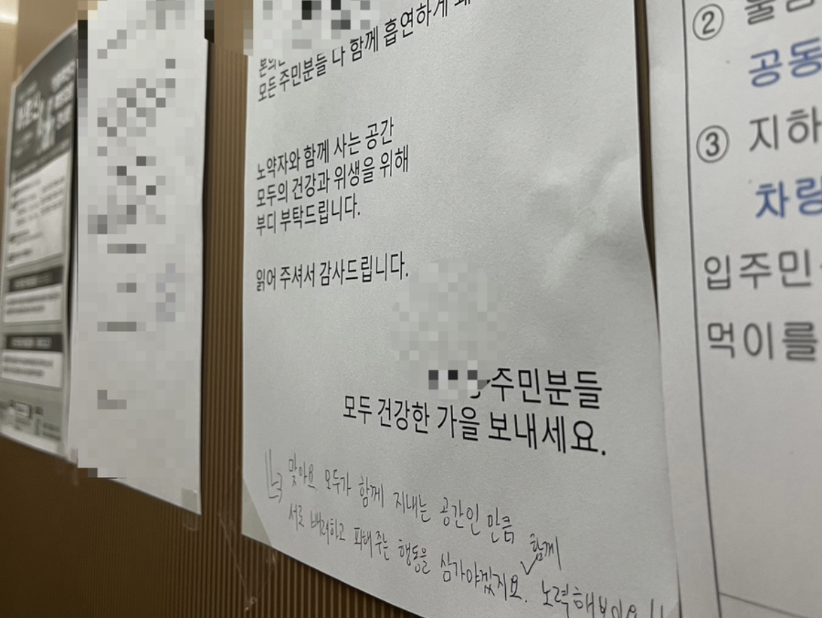 며칠전, 살고있는 아파트에서 공용구역에 흡연 흔적을 발견했는데요. 그 길로 실내흡연을 삼가해달라는 메모를 출력해 붙여놨는데, 이틀 후 제 메모에 한 댓글이 보였어요. 함께 노력하자는 익숙한 필체의 댓글, 남편이었어요. 필자가 나인줄 알았나싶어 물어봤더니 나인줄 몰랐다고 놀라더라고요. ㅋㅋ 역시 다 달라도 오지랖 데시벨은 여전히 비슷했구나 실소를 참지 못했네요. 잠깐이었지만 옛날 우리를 만난 것 같은 느낌이었네요. ㅋㅋㅋ 그러게.. 우리가 이렇게 닮았었지...