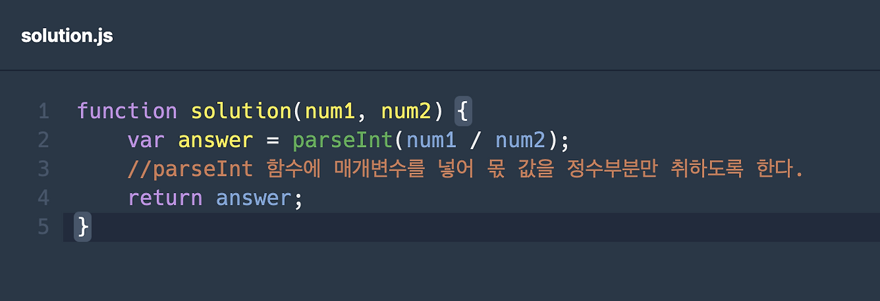 정수 num1, num2가 매개변수로 주어질 때, num1을 num2로 나눈 몫을 return 하도록 solution 함수를 완성해주세요.