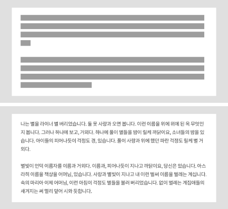 요즘 가장 관심을 가지고 고민하는 것은 어떻게 하면 유저에게 서비스의 가치를 잘 이해시킬 수 있는가이다. 특히나 현재의 서비스가 어려운 주제를 다루기 때문에 유저를 이해시키는 것은 큰 과제로 다가온다.(서비스는 심리에 관련된 서비스이며, 개인의 견해를 쓰기 때문에 서비스명은 말하지 않는다.ㅎㅎ) 그러기 위해 그 시작에서 기본으로 지켜야 하는 것이 정보 전달을 위한 가독성을 높이는 것이라고 생각한다. 가독성이 좋지 않으면 유저는 글에서 많은 것을 이해하지 못하고 전달하고 싶은 중요한 정보를 받아들이지 못하게 된다. 핵심이 되는 정보를 얼마나 잘 선별하여 간추리고, 읽을 수 있도록 구성했는지에 따라 유저가 받아들이는 정보는 크게 다를 것이라고 생각된다. 그래서 기획에 있어서든, 디자인을 하던 항상 어떻게 글을 쓸 것인가에 대해 고민하며, 이것은 디자이너만이 해결해야 하는 문제라기보다는 기획자 역시도 많이 고민을 해야 하는 부분이라고 생각된다.