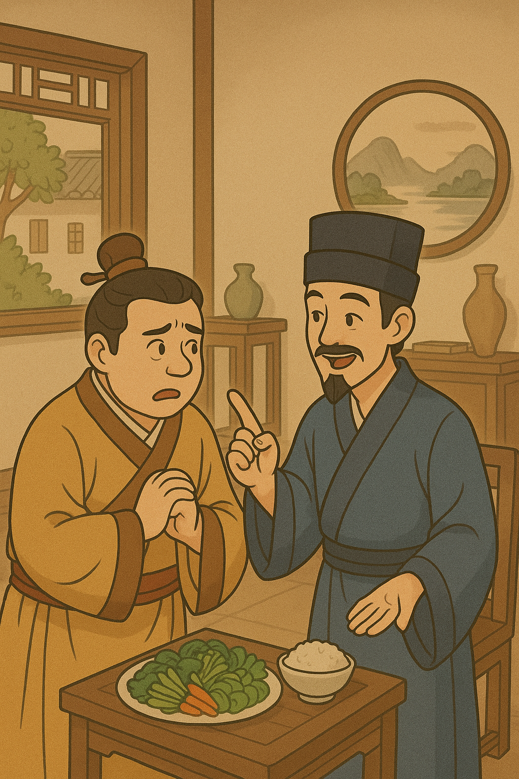 그러나 첫 수업을 마친 뒤 선생님이 받아든 밥상에는 채소 반찬만 올라와 있었고, 이를 본 선생님은 크게 화를 내냈습니다.“어찌 고기 반찬 하나 없이 채소 요리만 대접을 합니까?”