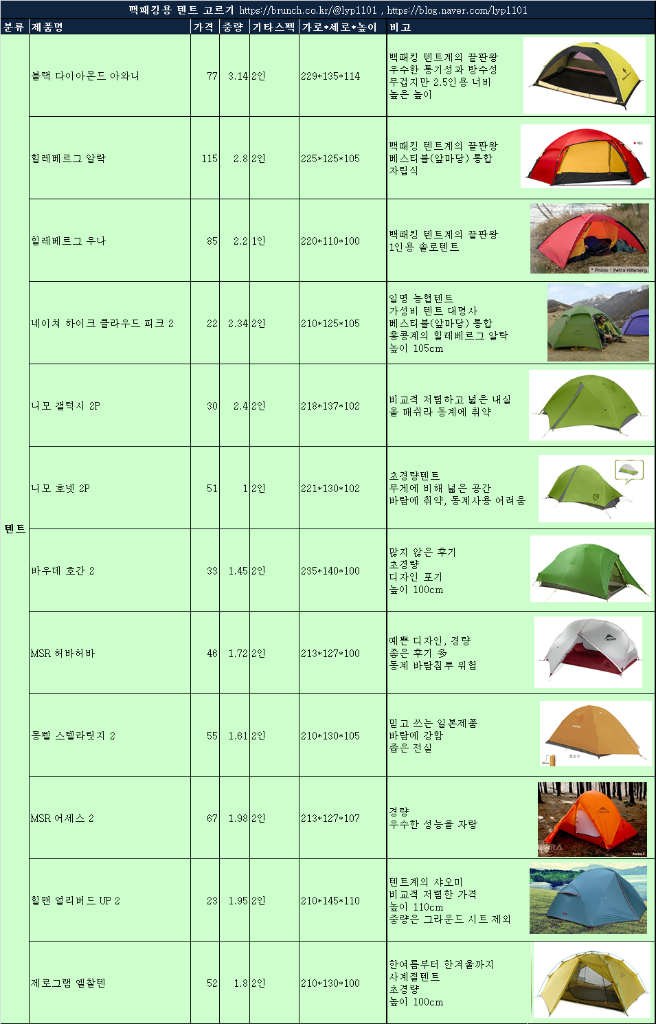 백패킹용 텐트의 성능도 중요하지만, 인터넷 후기가 상품 판매에 지대한 영향을 미치는 요즘 바람에 찢어지거나 빗물이 새는 일은 없을 듯하여 성능은 제외하였다.