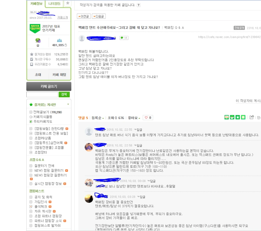 혹자는 네이버 검색을 신뢰하기 어려운 이들은 텐트카페를 가입하여 정보를 얻기도 한다.