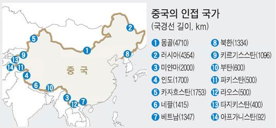 중국은 무려 14개나 되는 국경선을 지닌 세계 최다 국경 인접 국가이다.