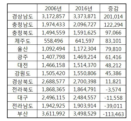 경상남도는 지난 10년 인구가 가장 많이 늘어난 도(道) 지역이었다. (수도권, 세종시 제외)