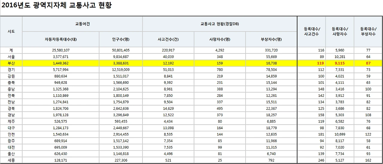 통계로 따지면 부산은 자동차 등록대수 대비 사고나 사상자가 많은 편은 아니다.