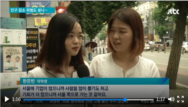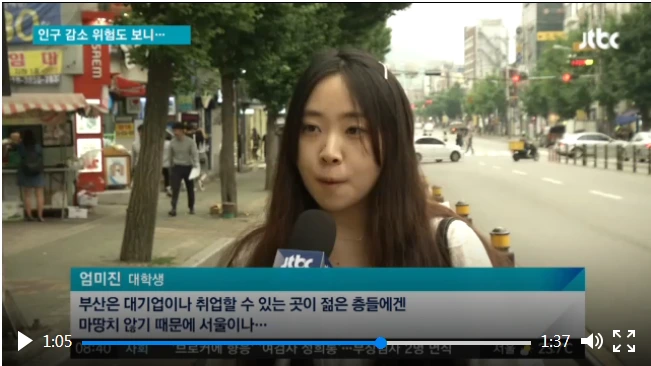 JTBC는 '지역별 인구감소 위험도' 뉴스에서 부산의 인구감소 원인을 청년들의 취업을 위한 상경과 저출산 문제로 꼽았다.