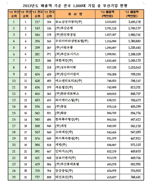 1위 르노삼성자동차마저도 전국 117위 수준이며, 1000대 기업 內 부산 기업 평균매출은 7300억원으로,