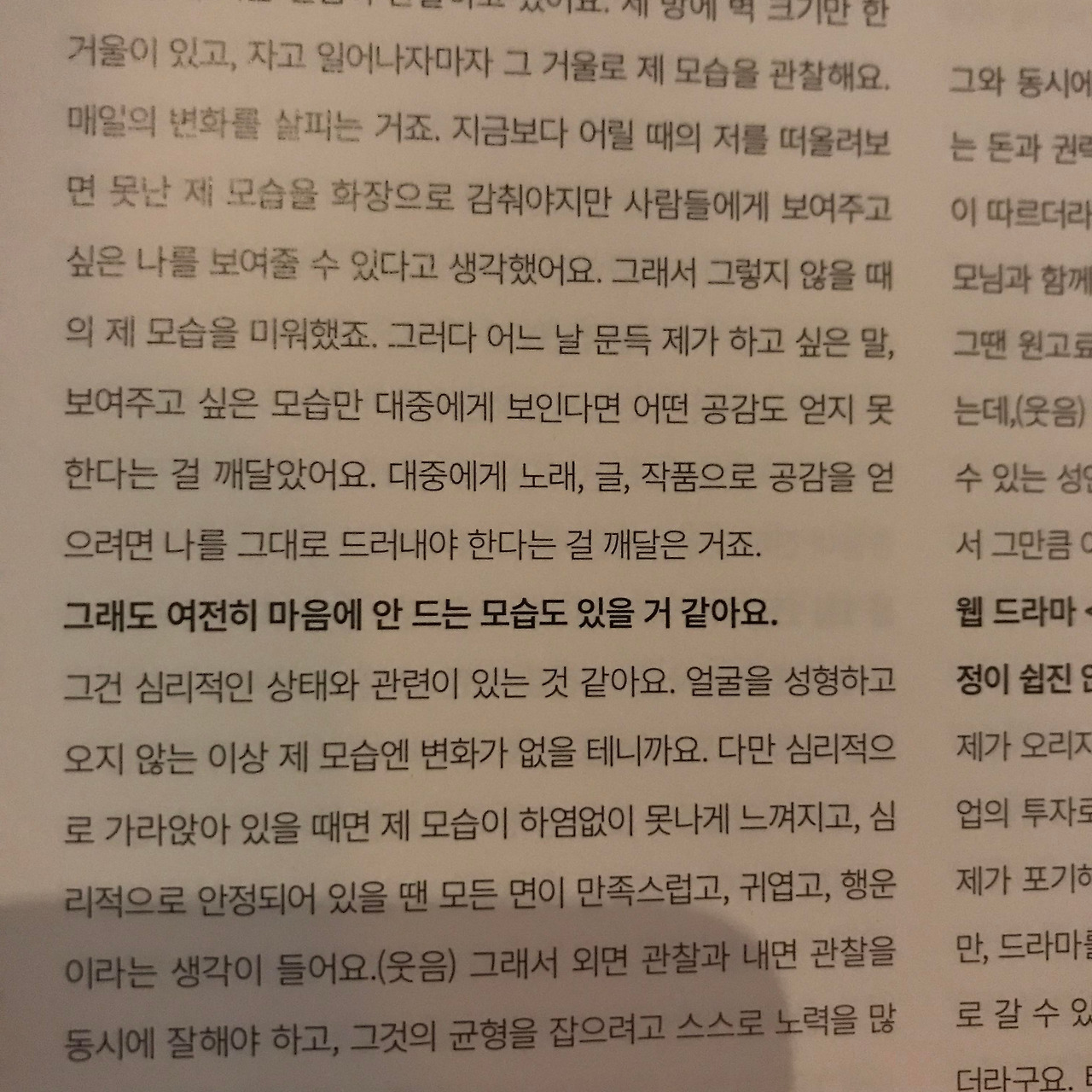 외부에서 보는 시선에 민감한 나에게 '대중에게 노래, 글, 작품으로 공감을 얻으려면 나를 그대로 드러내야 한다는 걸 깨달은 거죠'라는 말이 새삼스럽게 다가왔다. 나를 그대로 드러내는 것. 그걸 하려면 얼마나 더 용기를 내야 하는 걸까. 나를 그대로 '잘' 드러내려면, 얼마나 더 많은 노하우를 가져야 하는 걸까.