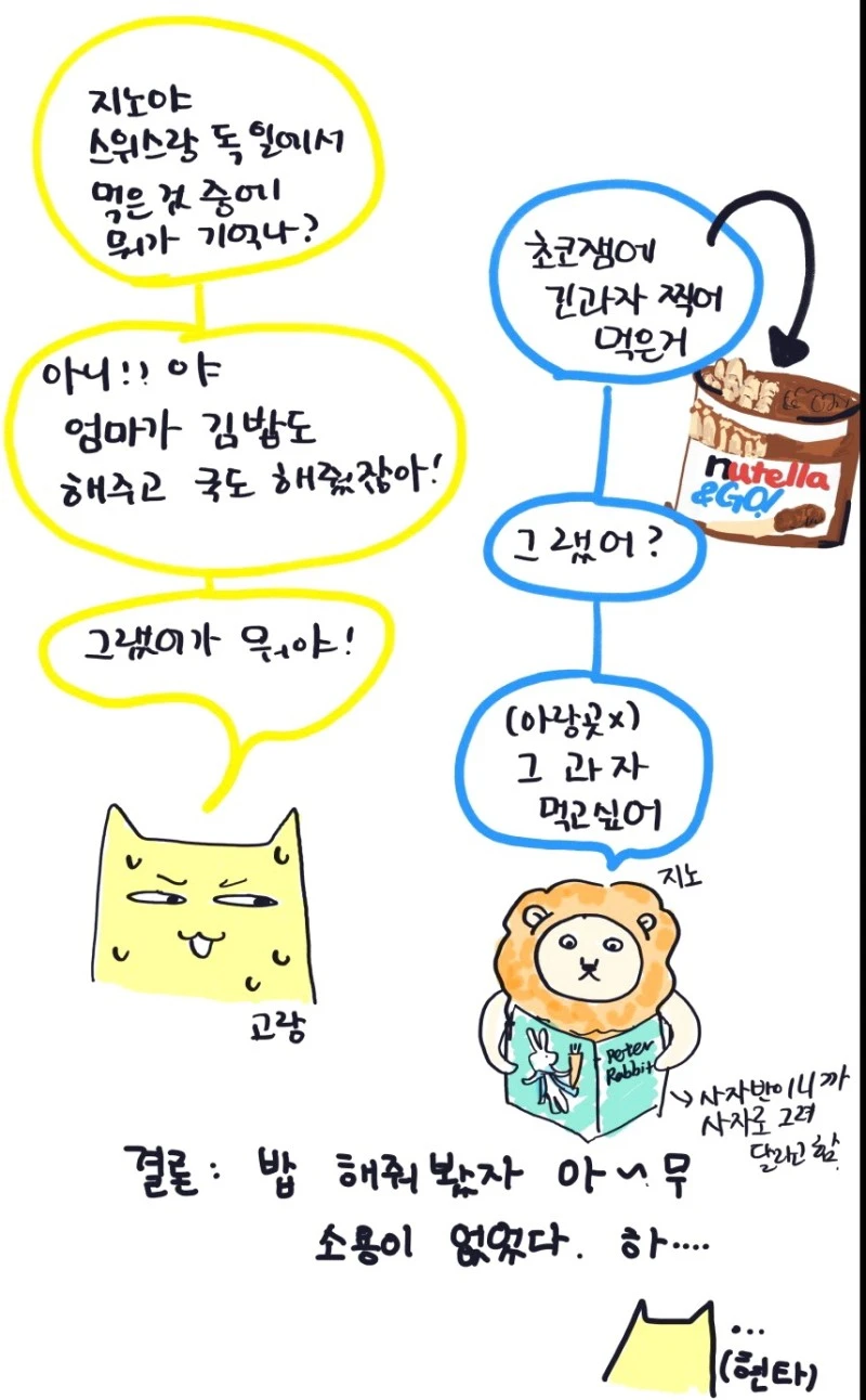 생각해보니 한국에서는 한 끼를 빵으로 먹인 날이 있다고 하더라도 그날 최소 1끼 이상 밥을 먹였었다. 아이에게 가장 익숙한 식사가 밥과 반찬, 국이었고 아이는 그걸 찾을 수밖에 없었다. 다행히 비행기에서 막 내린 취리히에서는 취리히에 사는 친구 리가 있었기 때문에 이틀 정도 친구 집에서 밥도 먹고 현지식도 먹으면서 적응을 할 수 있었지만, 다른 지역으로 이동을 해서 숙소에 묵자 바로 지노에겐 이 말이 터져 나왔다.