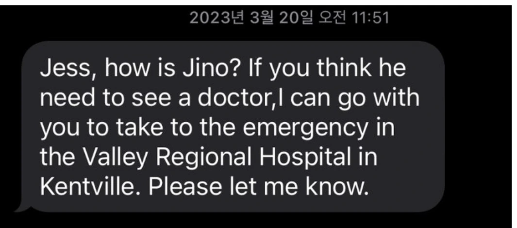 "제스, 지노는 좀 어때? 병원에 가야겠으면 내가 켄트빌에 있는 큰 병원에 있는 응급실에 같이 가줄게. 말해줘."