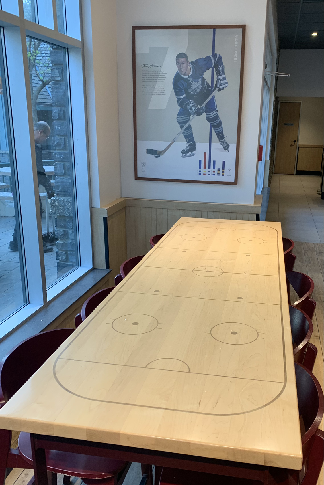 캐나다 사람들이 애용하는 커피점 Tim Hortons도 하키 영웅의 이름을 따온거다. 아래 팀홀튼 매장 사진을 보라 그의 사진이 벽에 자랑스럽게 걸려있고 테이블 무늬가 하키 경기장이다