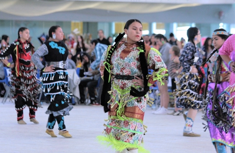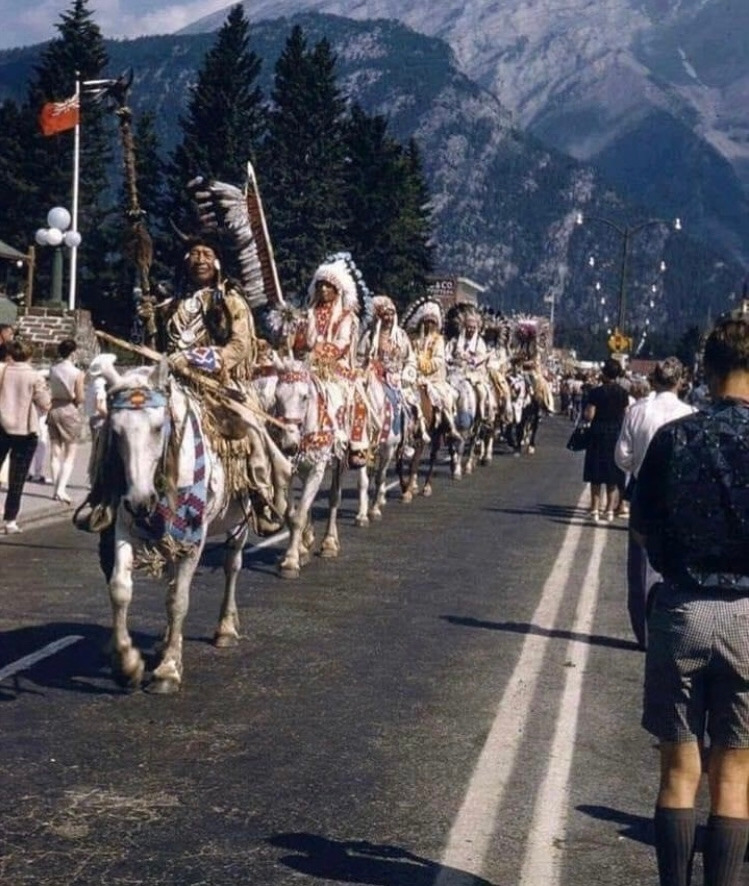 축제 때 원주민들이 전통의상을 입고 Banff 거리행진을 하고 있다.