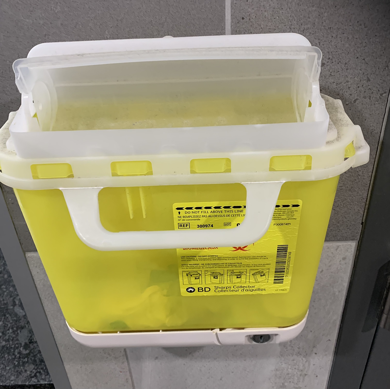 공공 화장실에는 다음과 같은 마약 주사기 수거함이 설치되어 있다.