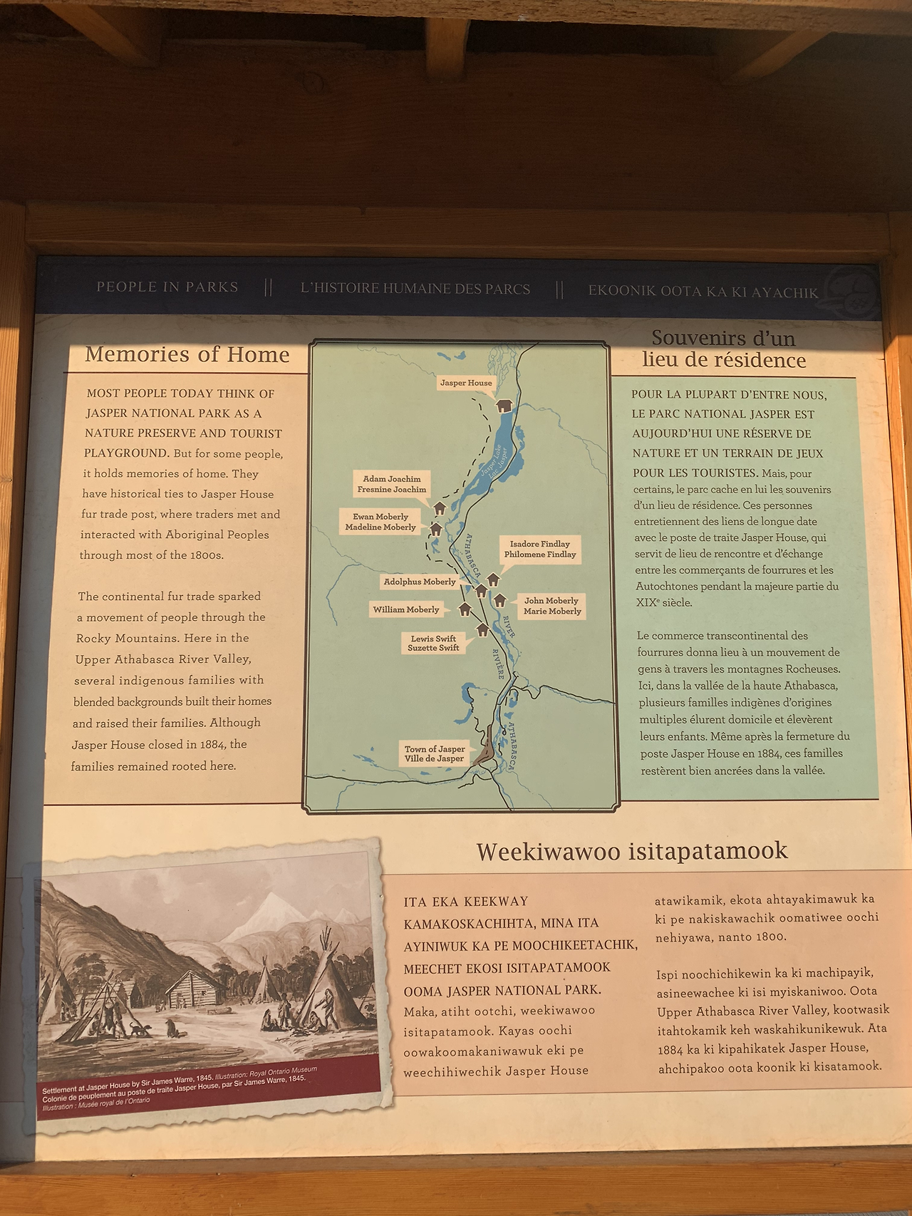 Jasper 안내 표지에 공식 언어인 영어, 프랑스어와 더불어 원주민 어로 원주민의 삶과 역사를 소개하고 있다.