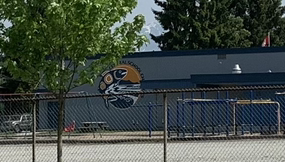 Vancouver의 한 초등학교 벽에 원주민 전통 회화가 심볼로 그려져 있다.