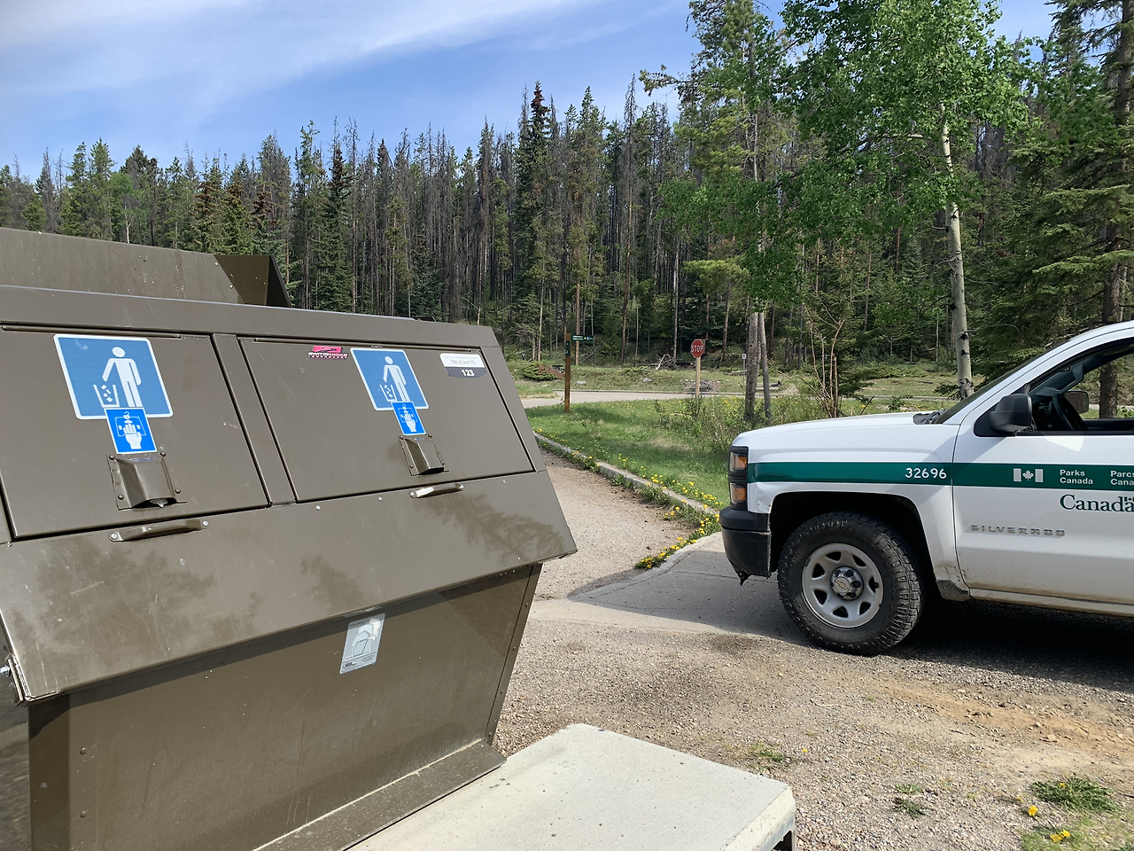 곰이 인간음식에 익숙해지는 것을 막으려고 쓰레기 통에 잠금장치를 설치한다.