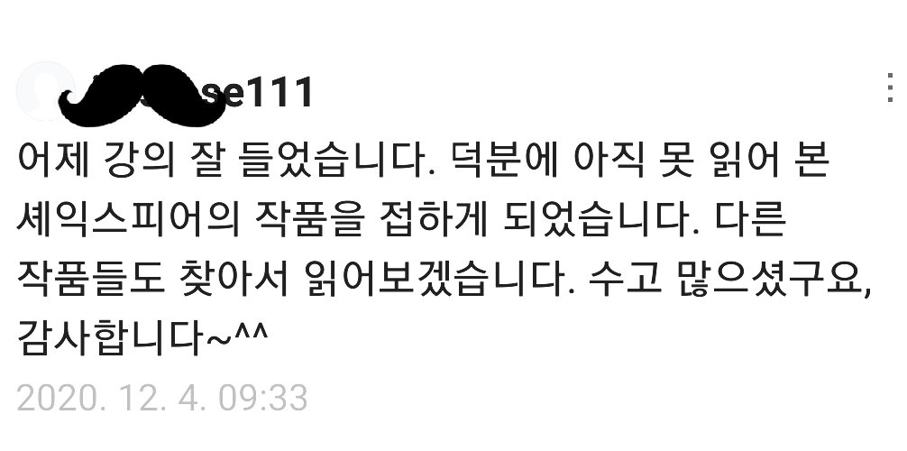 " Shakespeare " 전공. 나에 대한 생각, 타인에 대한 이해, 사회를 보는 길이 바로 문학이라 생각한다. 내게 나를 보여주는 거울이며 타인에게 향하는 창이며 통로이다.