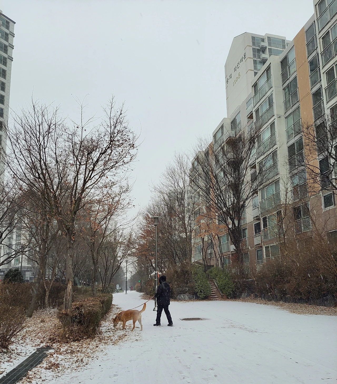내리는 눈을 마주하기 위해 자신의 분신 같은 충견을 데리고 나와 산책하는 사람, 눈을 음미하며 홀로 산책하는 사람, 부부, 친구, 아이들 다양한 모습의 사람들이 설경 안에 들어왔다. 우산을 쓴 사람들, 우산 없이 그저 모자를 푹 눌러 쓴 사람들, 그냥 그대로 눈을 맞는 사람들 모두 저마다의 방식으로 설경을 가슴에 담았다.
