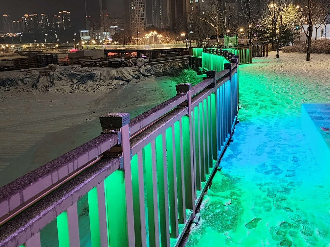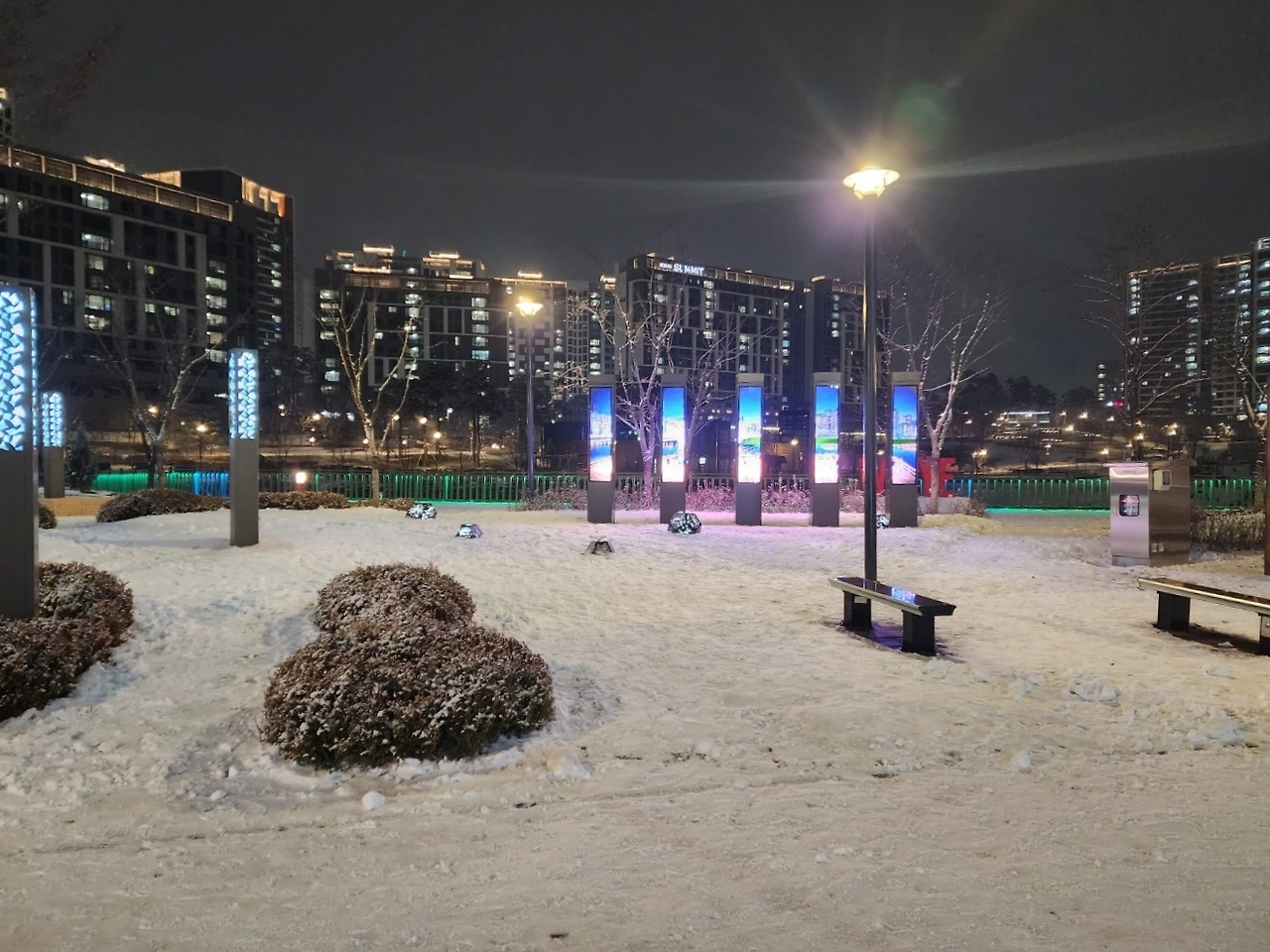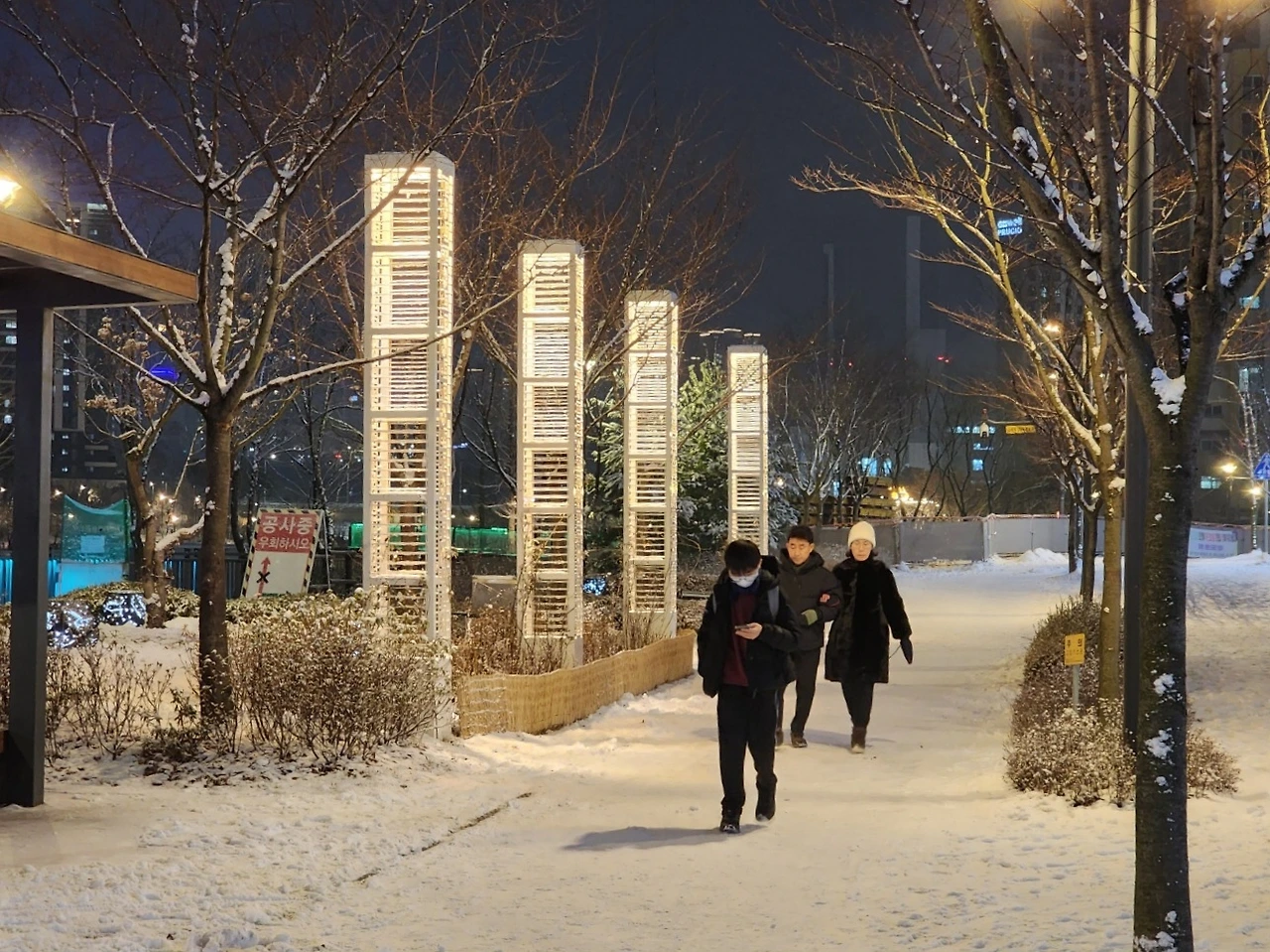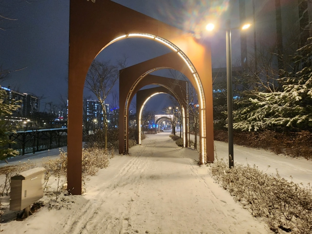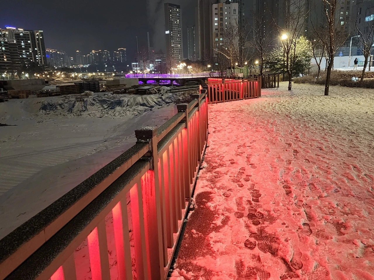 눈 위에 또렷이 새겨지는 발자국과 눈이 내리는 하얀 밤을 새기듯 밝히는 가로등 불빛을 타고 하염없이 눈이 내린다. 내리는 눈, 눈, 눈은 여전히 어둠 속에서 더욱 고혹적으로 빛을 밝힌다. 가로등 불빛을 타고 내리는 눈의 향연과 이 모두를 담은 설경을 한눈에 볼 수 있는 하얀 밤을 열며 위례의 네온 등이 순간 다채롭게 켜진다.