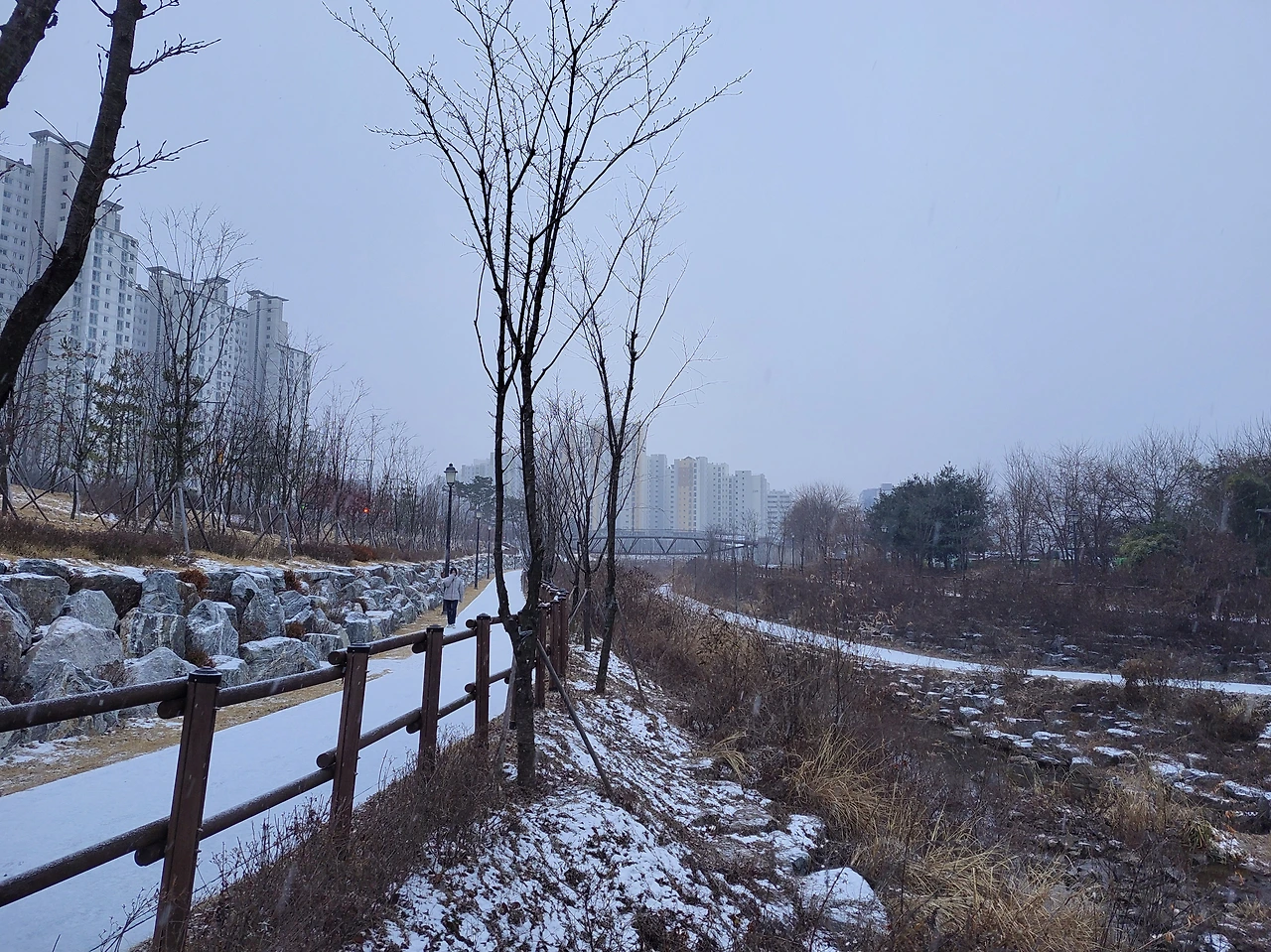 침묵하는 눈은 바라보는 누군가에게 한 편의 시가 되어 모든 장소에서 연출되는 설경을 품게 했다. 발자국을 만들며 눈길을 걸었다. 걸음을 옮길 때마다 ‘뽀드득. 뽀드득’ 소리가 계속 경쾌하게 울렸다. 모자를 쓴 머리 위로 ‘착 차르르락...’, ‘착 차르르락...’ 눈 내리는 소리가 들렸다. 장지천 흐르는 물 위로 내리고 있는 흰 눈의 정중한 행렬이 고요와 정적을 품어내었다.