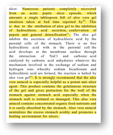 "많은 환자들이 급성 소화성 궤양에서 완전히 회복되었으며, 이는 알로에 겔의 염산분비억제, 펩신동화작용, 전반적인 해독작용에 기인한다 ... 알로에 베라 겔은 위벽이 자극을 받거나 손상되었을 때 위벽으로부터 위산을 보호한다. 알로에 베라 겔은 위에서 쉽게 흡수될 뿐만 아니라 과도한 위산을 중화하고 궤양의 치유 환경을 촉진한다."
