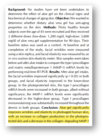"알로에 겔은 광노화 피부에서 콜라겐 생성을 증가시키고 콜라겐을 분해하는 MMP-1 유전자 발현을 감소시켜 광노화 인간 피부의 주름과 탄력을 크게 개선한다."