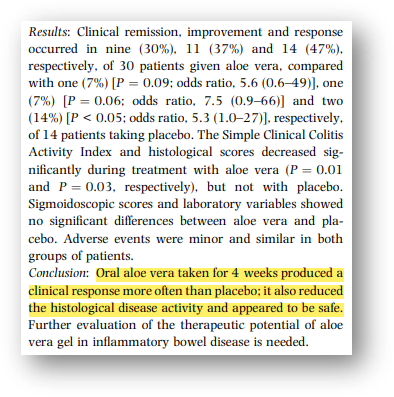 참고 논문 : Langmead, L., Feakins, R. M., Goldthorpe, S., Holt, H., Tsironi, E., De Silva, A., ... & Rampton, D. S. (2004). Randomized, double‐blind, placebo‐controlled trial of oral aloe vera gel for active ulcerative colitis. Alimentary pharmacology & therapeutics, 19(7), 739-747.